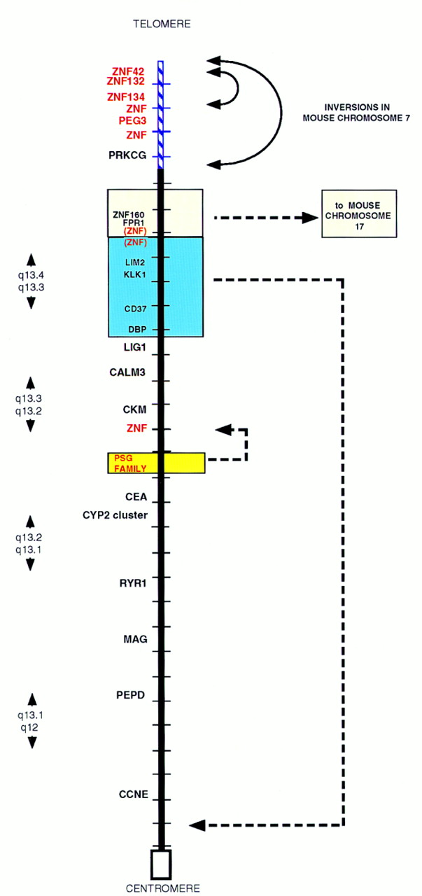 Positions and borders of the major evolutionary rearrangements between human 19q and mouse chromosome 7. Comparative map of human chromosome 19q and related regions in the mouse. The physical map of human 19q is represented, showing the positions of segments that are rearranged in order in mouse. Only a few anchor markers are presented for simplicity. Each crosshatch bar in the map represents a distance of 1 Mb in the human physical map. Colored boxes surround regions that are transposed in order in mouse relative to human; broken arrows indicate the positions to which they have been moved in the mouse genomes. Blue hatching on the backbone of the map indicates the extent of a large inversion in Mmu7 relative to H19q13.4; a smaller inversion, involving genes related to ZNF132, ZNF134, and related clustered zinc finger gene family members, comprise a second, nested inversion within this larger region. Genes located at the borders of each rearranged segment are indicated in red. A number of zinc fingers containing genes have been identified on chromosome 19q and in related regions of Mmu7; some have been characterized and are indicated by specific locus names (e.g., ZNF134); clusters of other genes that have not been completely sequenced or assigned locus names are indicated simply as ZNF on this map. Data are compiled from published studies (Ashworth et al. 1995;Stubbs et al. 1996; Kim et al. 1997; Shannon et al. 1997); additional information can be obtained from the original references.