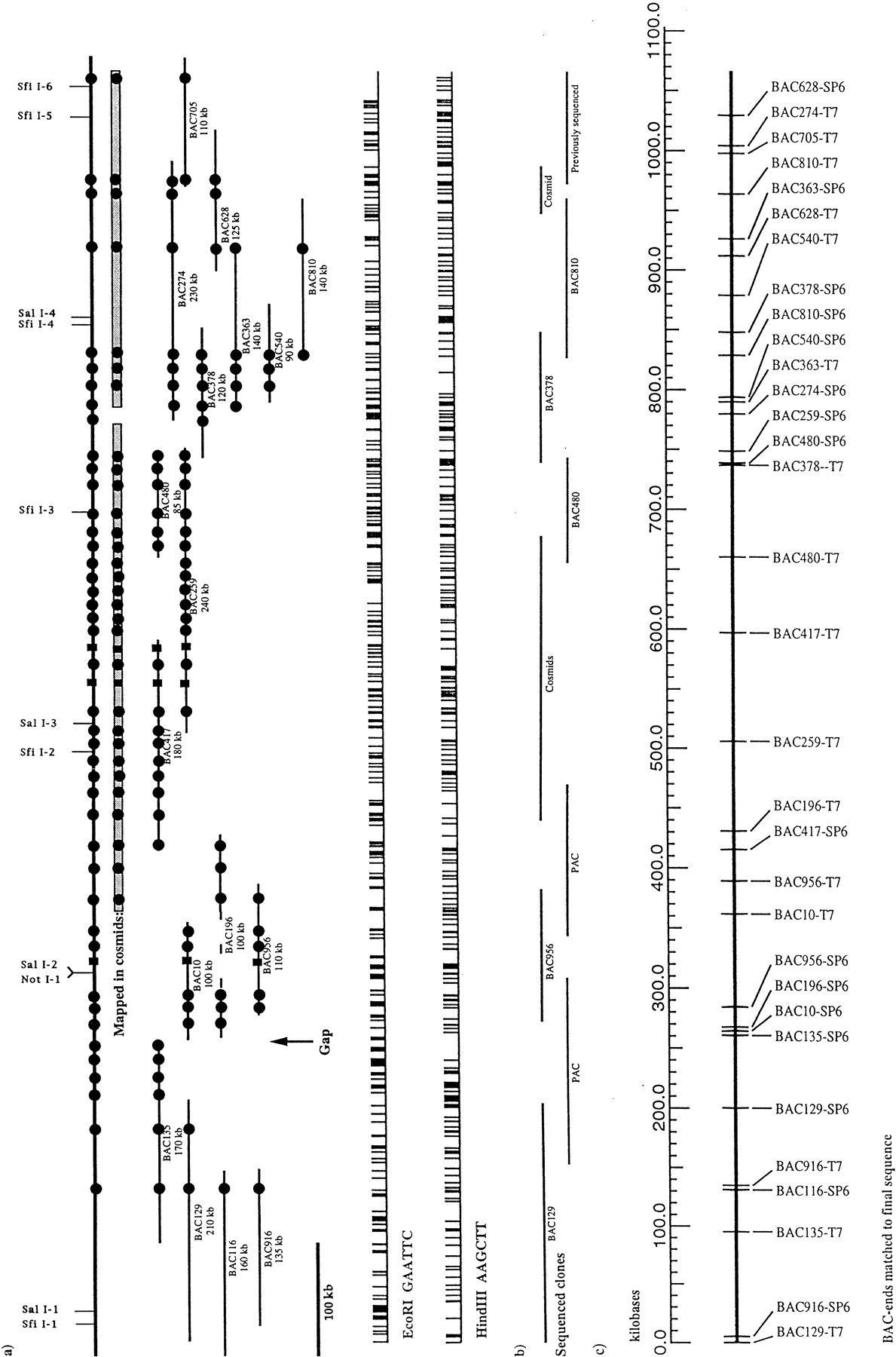 Physical maps of the human α/δ TCR locus. (a) Seventeen BAC clones, with sizes as determined by PFGE indicated, spanning the α/δ locus. The BAC clones were characterized in several different ways: restriction enzyme analysis (HindIII and EcoRI sites shown), by localization of TCR elements by hybridization (•), by STS mapping (▪), and by PFGE analysis. These results were compared to similar data obtained for overlapping YAC and cosmid clones. The relative order for most across the locus is known because of a cosmid map of high redundancy. The exact order of several probes could not be determined in several BAC clones not covered by the cosmid map. The gap between the two BAC contigs is indicated as is the deletion in BAC196. (b) The positions of the sequenced BAC, PAC, and cosmid clones are indicated. (c) End sequences obtained from each BAC clone were compared to the final sequence and their positions indicated. The complete names of the BAC and PAC clones presented are as follows: BAC10G10, BAC116B10, BAC129A3, BAC135H10, BAC196E6, BAC259E10, BAC274H3, BAC363D9, BAC378F4, BAC417G3, BAC480F2, BAC540C5, BAC628B12, BAC705G10, BAC810D3, BAC916C11, BAC956H7, PAC161M22, and PAC230I21.
