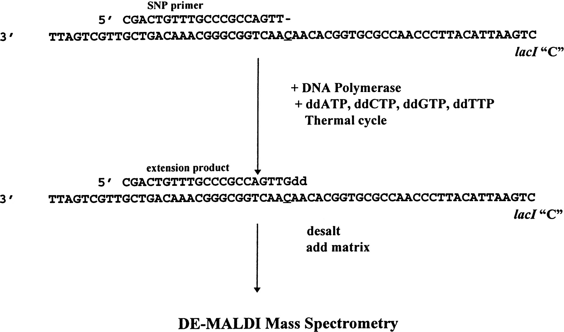 Model system for single nucleotide polymorphism detection. SNP primer was annealed as indicated to the test sequence containing a polymorphic site at the underlined position. In the presence of a DNA polymerase and four ddNTPs, the primer is extended by a single base complementary to the polymorphic site. When subjected to DE-MALDI-TOF, the difference in mass between unextended and extended primer indicates which bases were added.