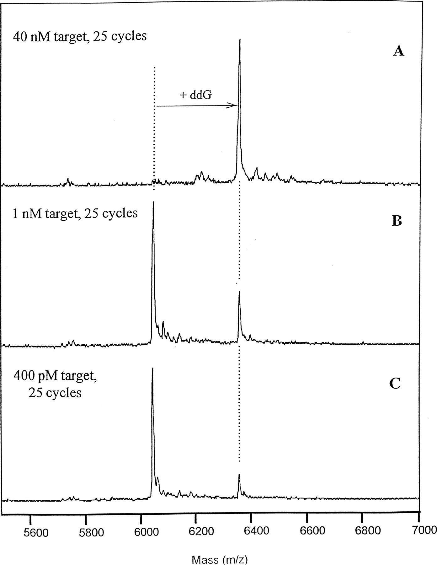 Identification of polymorphism at low level of target DNA. The primer extension assay was conducted with ThermoSequenase as described in Methods in the presence of 10 μm ddNTPs. (A) Forty nanomolar target sequence; (B) 1 nm target sequence; (C) 400 pm target sequence.