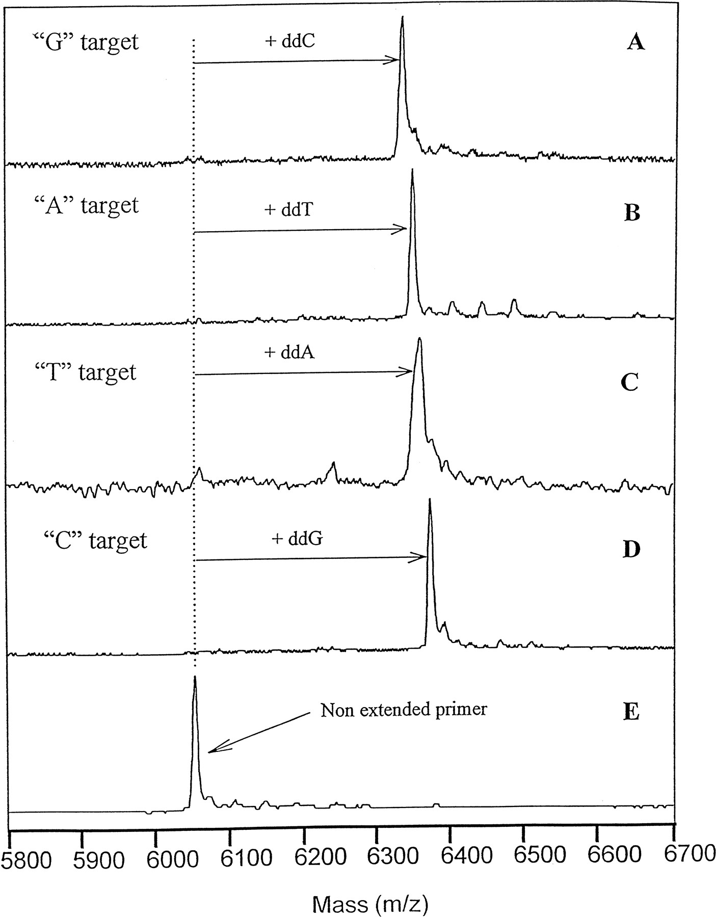 Specificity of primer extension reaction in the presence of 4 ddNTPs. The lacI model system was tested in the presence of ThermoSequenase, all four ddNTPs, and targets containing a different base at the polymorphic site. (A) G target; (B) A target; (C) T Target; (D) C target; (E) negative enzyme control.