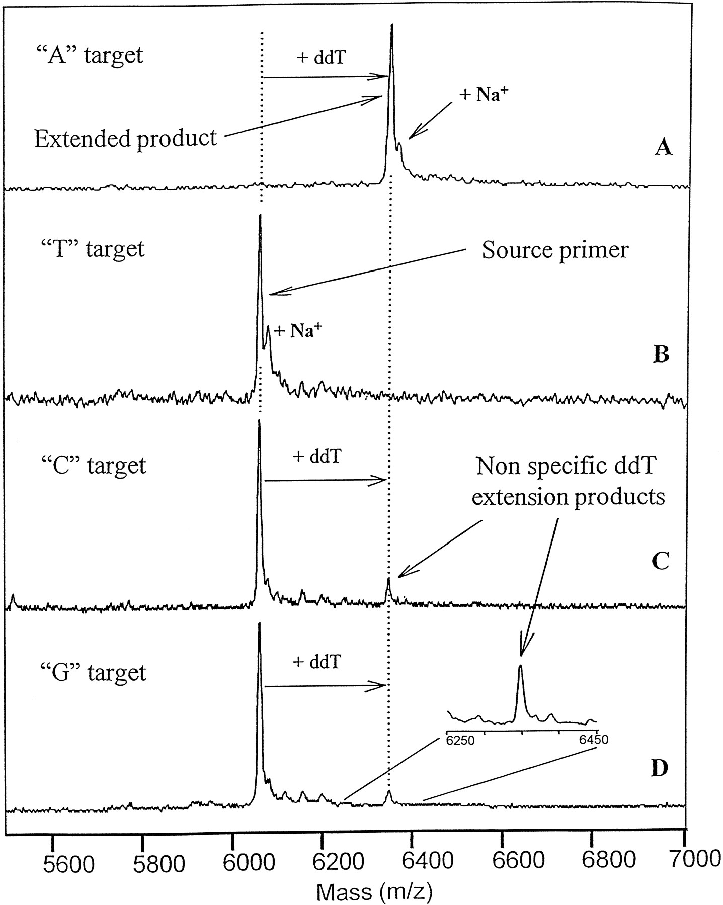 Specificity of extension in the presence of ddTTP. The lacImodel system was tested in the presence of ThermoSequenase, ddTTP, and targets containing a different base at the polymorphic site. (A) A target; (B) T target; (C) C target; (D) G target.