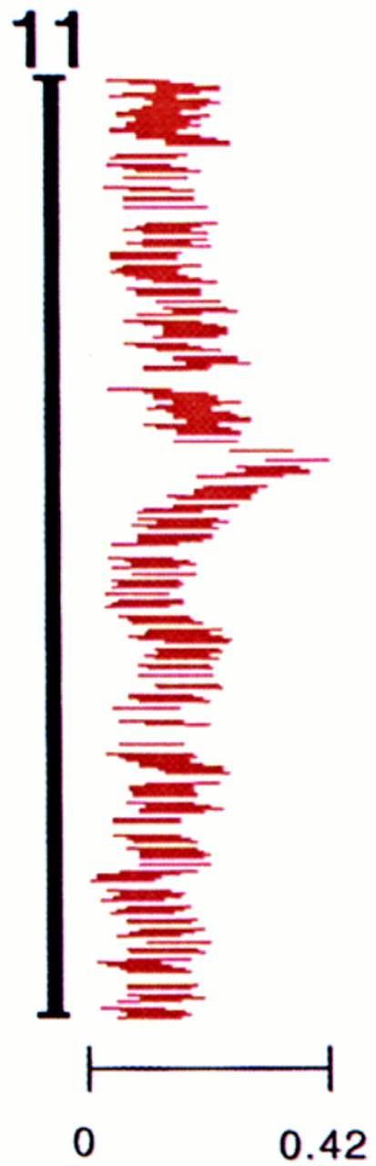 Retention frequencies of markers in RHs. Depicted is the distribution of the retention frequencies of the STSs on the comprehensive RH map for human chromosome 11. Each STS is represented as a bar of constant, arbitrary length. The frequencies range from 0.06 to 0.42. Average retention frequencies for all of the chromosomes are included in Table2.