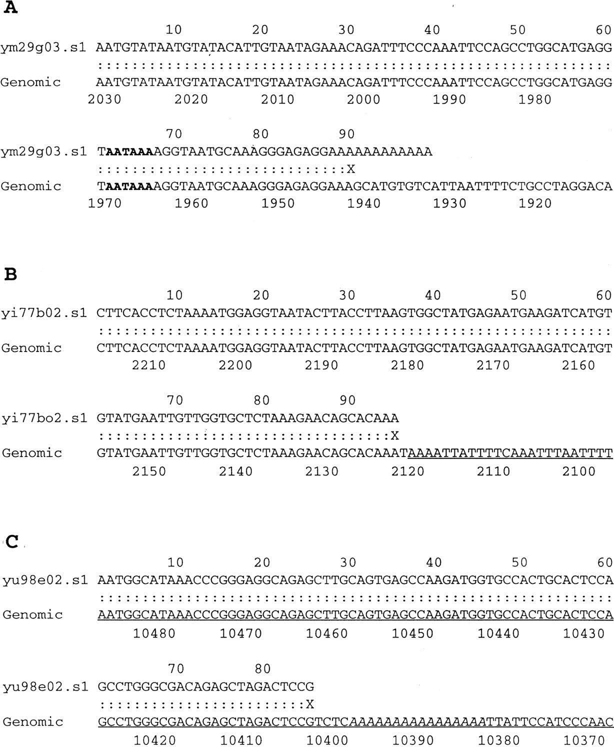 A FASTA alignment (Pearson and Lipman 1988) between three EST clones associated with cDNA 37 and their corresponding genomic DNA (only 90 bp of the 3′ end of each EST are shown). (A) An authentic EST corresponding to the end of cDNA 37 that possesses a poly(A)+addition signal (AATAAA). Note that the poly(A) tail has not been completely trimmed. (B) An EST that is associated with the end of cDNA 37, but does not have a poly(A)+ addition signal and appears to have arisen by internal priming. The sequence starts 180 bp 5′ of the true end of the clone. Analysis of the sequence trace does not suggest that this sequence read was excessively trimmed to produce the 180-bp difference (data not shown). The underlined sequence immediately 3′ to the end of the alignment is an Alu sequence. (C) An EST that aligns to the intron of cDNA 37 and contains no poly(A)+addition signal (this EST sequence was edited from the available sequence traces files) The alignment begins 5 bp 5′ of a stretch of poly(A) (in italics). The underlined sequence represents anAlu sequence.