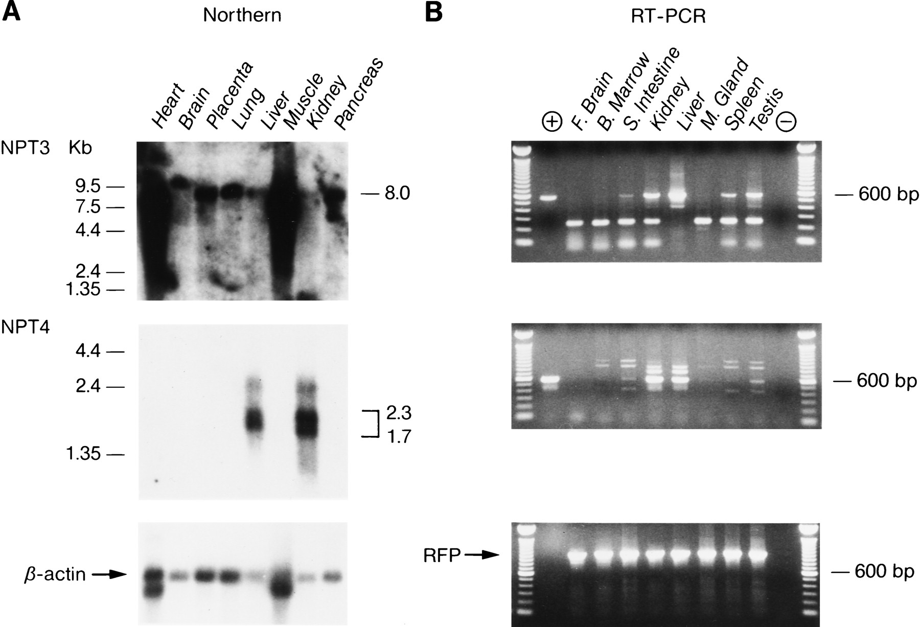Expression analysis of the NPT3 and NPT4 genes. (A) Northern blot analysis of NPT3 and NPT4. NPT3 is expressed at high abundance in the heart and muscle as a single 8.0-kb transcript. Lesser amounts are found in the other tissues. The expression pattern of NPT4 is more restricted, being found only in the liver and kidney as a mixture of transcripts ranging from 2.3 to 1.7 kb. (B) RT–PCR analysis of theNPT3 and NPT4 genes. Included in the (+) lane are the NPT3 and NPT4 cDNA positive controls. TheNPT3 gene is expressed as the proper size PCR fragment in the small intestine, kidney, liver, spleen, and testis. A smaller fragment is detected in all tissues with the exception of the liver. The no-DNA control lane (−) is negative. NPT4 is expressed as the proper size fragment in the small intestine, kidney, liver, and testis. Larger and smaller size fragments are found in all other tissues with the exception of the brain. For both genes, these different size fragments may indicate alternative splice events. The no-DNA control lane (−) is negative. The RFP primers show the integrity of the cDNA.