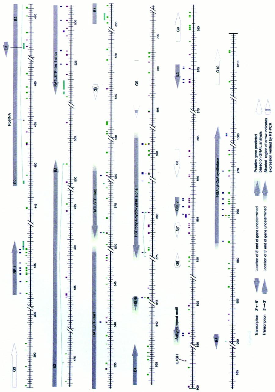 Summary of the computational analysis of the DNA sequence data in the 5q31 region. The scale is in kilobases. The locations and directionality of the putative genes are indicated by arrows and were determined based on database matches and/or GRAIL predictions. Similarity matches to known proteins, ESTs, and to the noncoding regions of known genes are color-coded as described in the key. If the conceptual translation of a putative gene was homologous to more than one protein then the locations of the similarity matches to those proteins with the highest and second highest BLASTX scores are indicated. Matches with human ESTs generated by the WashU–Merck Human EST project are distinguished from matches with ESTs generated by other groups. Only exact human EST matches and mouse EST matches with 85% or greater nucleotide identity are shown. If an EST contained gaps and matched the genomic sequence in more than one place, this was presumed to be attributable to the splicing of an intron and the EST segments were joined together by a line. GRAIL predicted exons in the forward strands are distinguished from those in the reverse strand by their color, as described in the key. If GRAIL predicted exons at the same location in both the forward and reverse DNA sequence strands, those that correspond to the coding strand (i.e., those GRAIL predictions having the same direction as the putative gene) are shown.