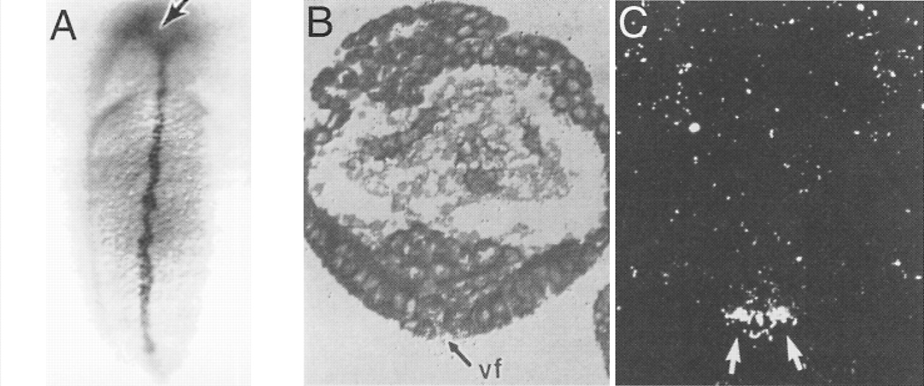 Comparison of the expression patterns of the sim genes. (A) Drosophila sim protein is expressed in the cells at the ventral midline (indicated by the arrow). (B,C) Bright-field and dark-field views, respectively, of a transverse section of a Drosophila embryo of the same stage as that inA. The sim transcripts are found in the midline cells (white arrows) at both sides of the ventral furrow (vf). (D,E) Transverse sections of an embryonic day (E) 9.5 mouse brain at the level of the diencephalon (di). The mouse Sim2 is expressed in the ventral diencephalon including its midline (D), whereasSim1 is expressed in cells adjacent to the midline (E). (F) Transverse section of an E10.5 mouse spinal cord shows that Sim1 is expressed in cells at both sides of the floor plate (fp), the ventral midline of the spinal cord. [A–C are adapted, with permission, from Thomas et al. (1988).]