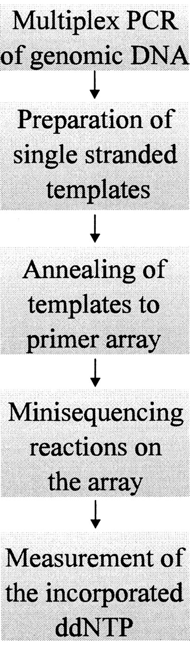 Steps of minisequencing on a primer array.