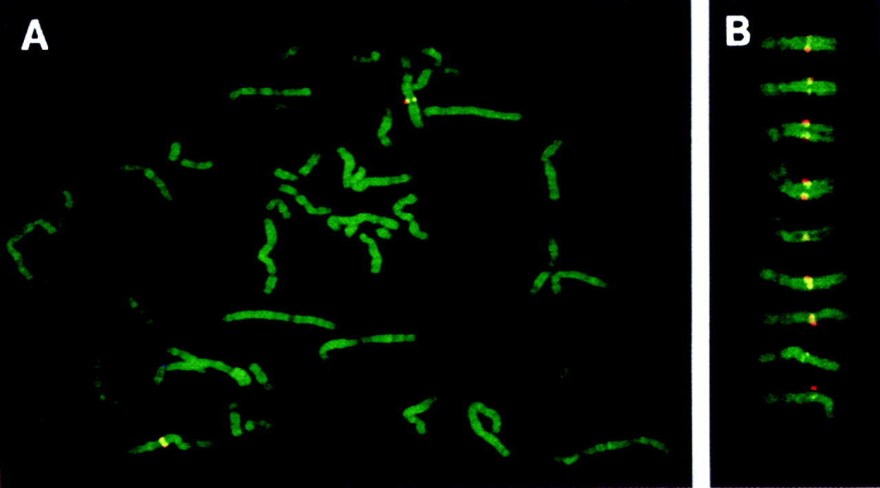 Chromosomal localization of the BAC clone KB153H1 containing the human SIM1 gene to 6q16 by FISH and Q-banding. (A) Metaphase chromosomes of human B-lymphoblastoid GM130B cell line hybridized with the BAC clone KB153H1. (B) Representative images of human chromosome 6. Hybridization signals appeared in the same position, 6q16, in all cases.