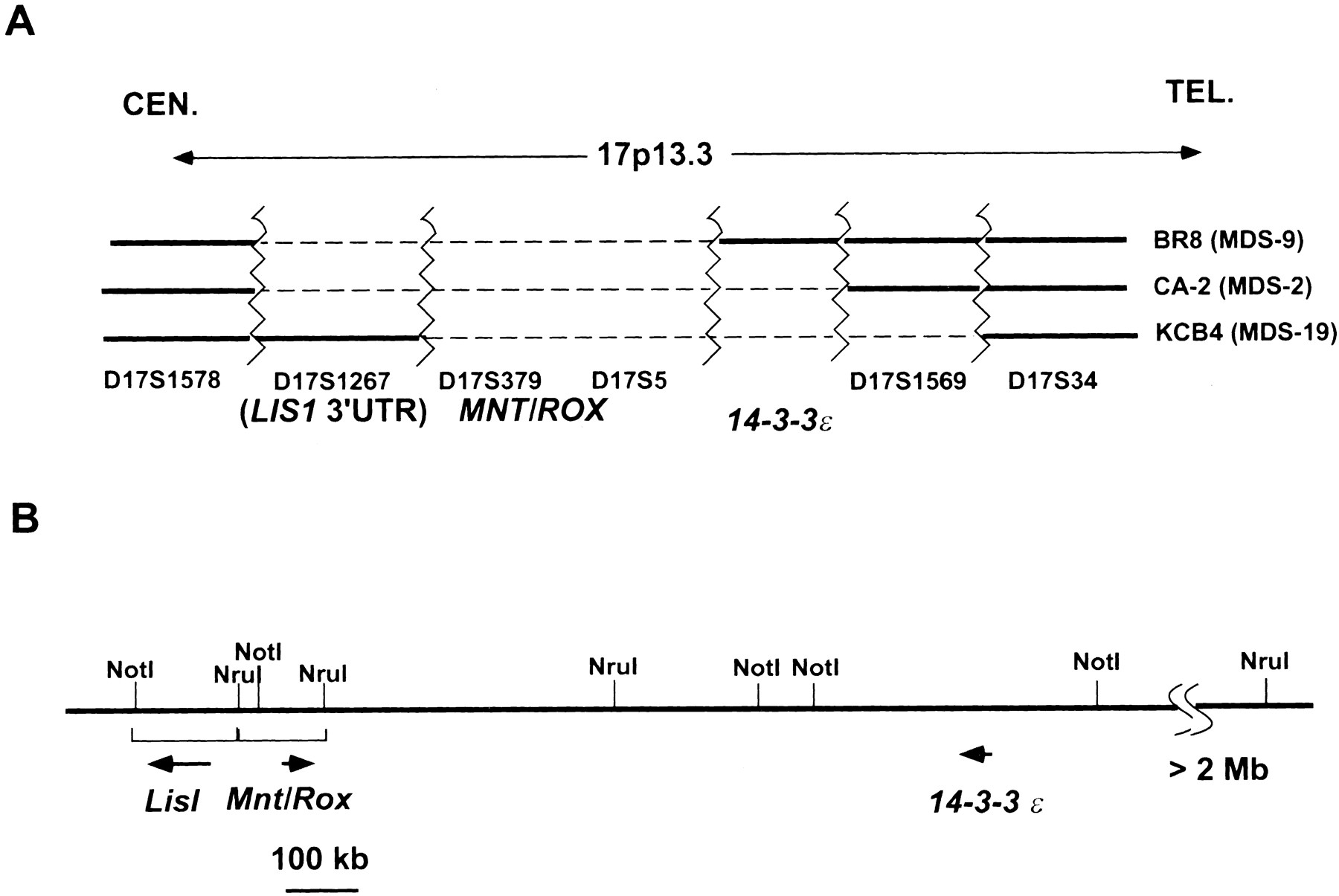 Comparison of human and mouse genomic organization in the MDS/ILS critical region. (A) Gene organization in the human MDS/ILS region on human 17p13.3 (after Chong et al. 1997). The broken line indicates the extent of deletion in each patient. The locations of genes and polymorphic markers are indicated at the bottom. (B) Murine syntenic region of 11B2.