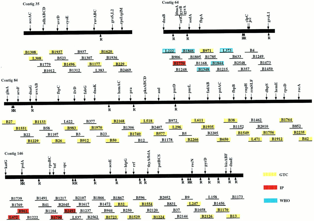 M. leprae genome map indicating regions discussed in the text. Cosmid clone names (starting with B or L) follow the M. lepraemap (Eiglmeier et al. 1993). Cosmid sequences described here are indicated by yellow boxes (see Table 3, below). Red and blue boxes indicate cosmids sequenced by the Institut Pasteur (IP) and other members of M. leprae World Health Organization (WHO) genome consortium, respectively. Unboxed cosmids are mapped but not sequenced. Eighteen of the cosmids sequenced in this study overlapped to form contigs (eight contigs, averaging 67 kb in size). Most of the gaps remaining between adjacent sequenced cosmids were small, and many could be bridged by long-range PCR.