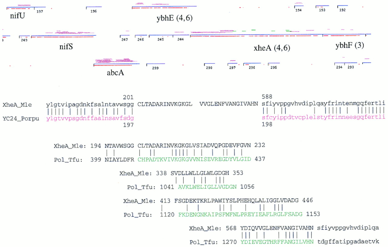 Analysis of the xheA intein. The tightly coupled operon shown is right-to-left 5′ to 3′: ybhF, xheA, ybhE, abcA, nifS, nifU shown in GenomeBrowser format. ORFs longer than 50 codons (blue horizontal lines) have stop codons indicated by short vertical black lines. Magenta horizontal lines above each ORF indicate matches to the NR database (Altschul et al. 1990) with significant BLASTP scores (P < 0.001), where the vertical displacement indicates the percent amino acid identity for that sequence segment. The red lines below the ORFs indicate quality of dicodon usage. Frame number, accession numbers, and gene names based on sequence similarity are in the text below the red lines. The xheA gene is located in M. leprae cosmid B1496 from nucleotide position 2020 to 9152. The amino- and carboxy-terminal regions have strong matches with eukaryotic, prokaryotic, and archaebacterial URFs (unknown function readingframes), including sp | P51240 | YC24_PORPU, and gi | 1742763 (E. coli) at 30%–42% identity (P < 1E-22) as does the central intein region (where intein BLASTP segments are in green to contrast with the normal magenta). The paralogous (intragenomic M. leprae) xheA–ybhF (gi | 466874) duplication is 24% identity, P = 2E-15. The numerals in parentheses represent the ORF numbers for a related cyanobacterial gene cluster (D64004). The sequence alignments (below) indicate the shift in amino acid identity pattern and the conserved motifs at the intein boundaries and internally.