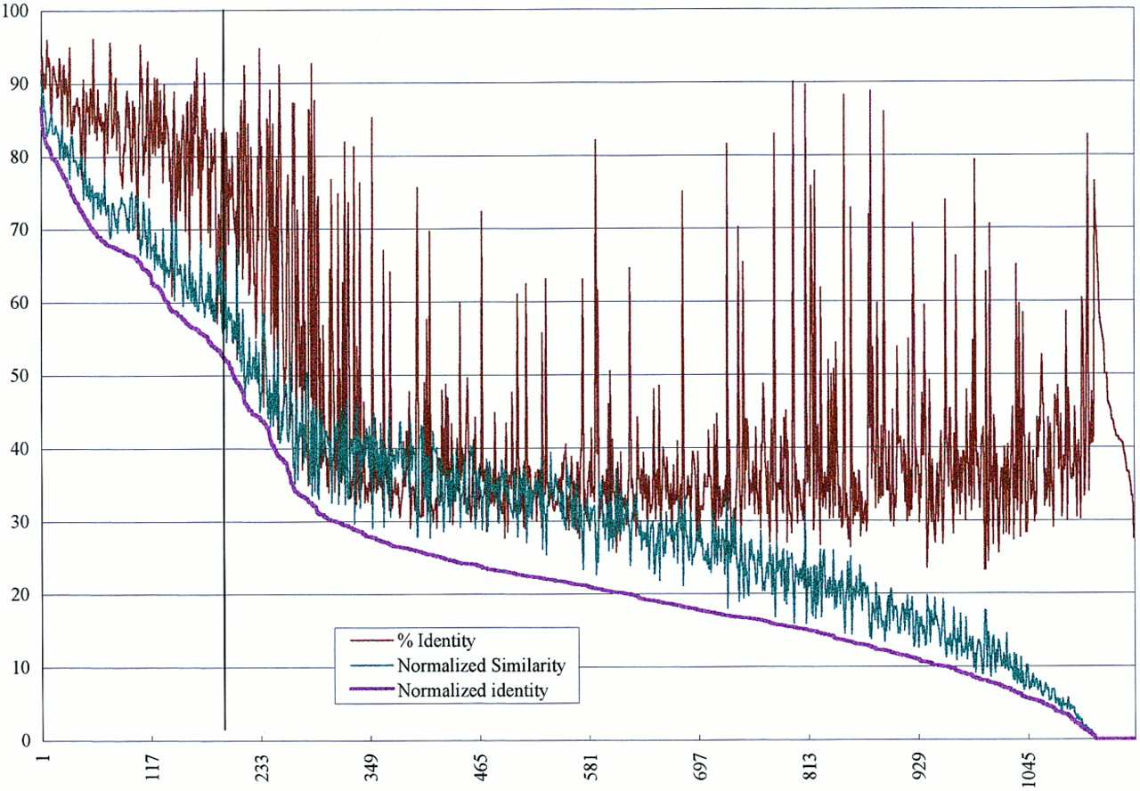 Summary of alignments from similarity searches between 1157 M. leprae proteins (including all of the gene products from this study) and 1564 M. tuberculosis proteins from GenPept. Each of the M. leprae proteins was searched against the set of M. tuberculosis proteins using an implementation of the Smith–Waterman algorithm with default parameters on a Biocellerator (Compugen) in conjunction with the GCG Wisconsin Package. The Normalized Similarity and % Identity values were obtained from the best alignment for each M. leprae protein by multiplying by the fraction of query amino acids represented in each alignment (no. of query residues in alignment/total query length). This was done to provide a better indication of the overall similarity of each M. leprae protein to the best M. tuberculosis homolog. The resulting values were termed Normalized Identity and Normalized Similarity. The pairs were sorted according to the Normalized Identity values in descending order, and the normalized values were plotted together with the raw percent identity values (for comparison) on a graph.