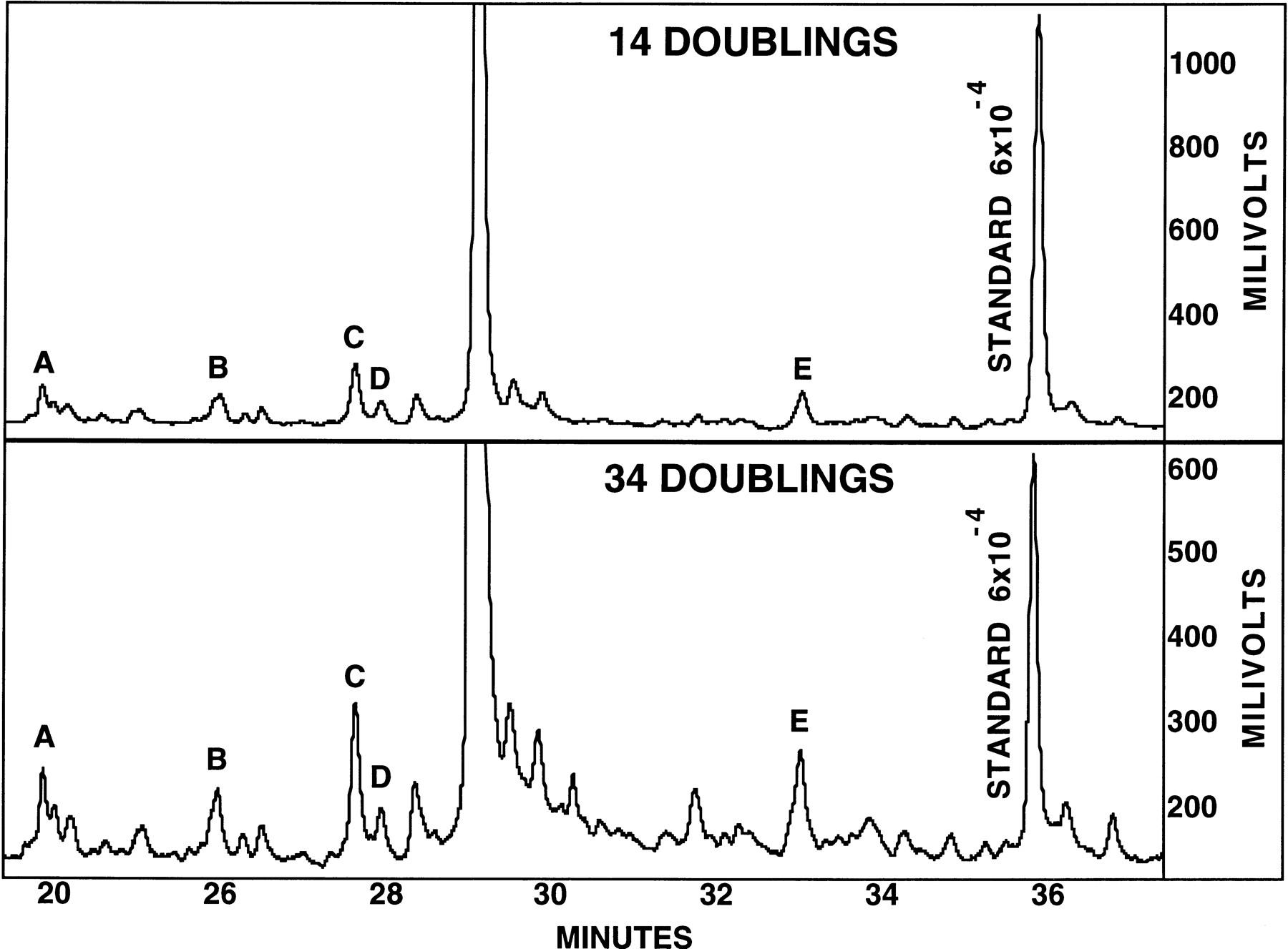 Analysis by CDCE of the purified homoduplex mutant fractions after 14 and 34 doublings using Pfu DNA polymerase. This CDCE was run using a 5% polyacrylamide gel in a 35-cm capillary with a 15-cm heated zone at a temperature of 70.6°C with a 5-μA current. Many small peaks after 14 doublings may be seen to increase significantly after 34 doublings. Of the major peaks for which the mutant sequences were determined, peak A is an AT → CG transversion at bp 10071 of human mitochondrial DNA; peak B is an AT → GC transition at bp 10108; peak C is an AT deletion occurring in a run of six consecutive AT base pairs at positions 10048–10053; peak D is an AT → TA transversion at bp 10071; and peak E is a GC → TA transversion at bp 10070.