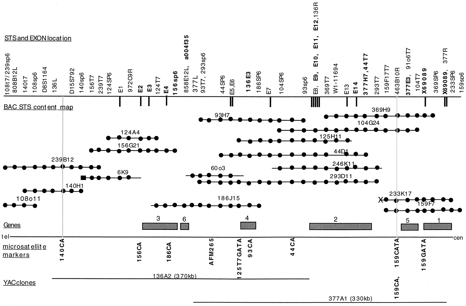 Physical map of the EPMR minimum genetic region. Seventeen BAC clones with their corresponding STS, exon, or microsatellite positions are shown in the middle. The BAC contig spans the region between the telomeric flanking marker 140CA and the centromeric flanking marker 159CA. (•) The BAC location of an STS, exon, or microsatellite marker, with its corresponding name at the top. Names in boldface type indicate exons or STSs from cDNA clones. (X) A chimeric BAC-end sequence; (▪) a repeat element. Exon sequences obtained from exon trapping are indicated as vertical bars protruding down from the top border. New microsatellite loci are indicated below the bottom border. Two midi-YAC clones are indicated at the bottom. Six putative gene locations are indicated by shaded boxes along the bottom border.