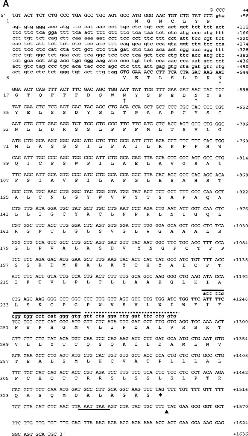 (A) Genomic DNA and cDNA structure of Dfy and deduced amino acid sequence of mouse Duffy-like protein. Amino acid residues are numbered on left; nucleotide positions are numbered onright. The exon and intron sequences are shown in uppercase and lowercase, respectively. The consensus sequence at the intron splice site is indicated in boldface letters. The three potential carbohydrate-binding sites to asparagine residues are shown in up arrows. The primers’ nucleotide sequences are shown in lowercase, italic, and boldface letters. P2 nucleotides are shown by a solid line and P1 by a dotted line. The underline is the polyadenylation signal. (▴) The polyadenylation site; (♦) the stop codon. (B) 5′-end promoter flanking sequence of Dfy. (▿) The position (+1) of the major transcription initiation site. Consensus sequences for the transcription factor binding sites are boxed, and the name of the corresponding factors are shown. The arrows indicate consensus sequences in sense strand (right) and antisense strand (left).