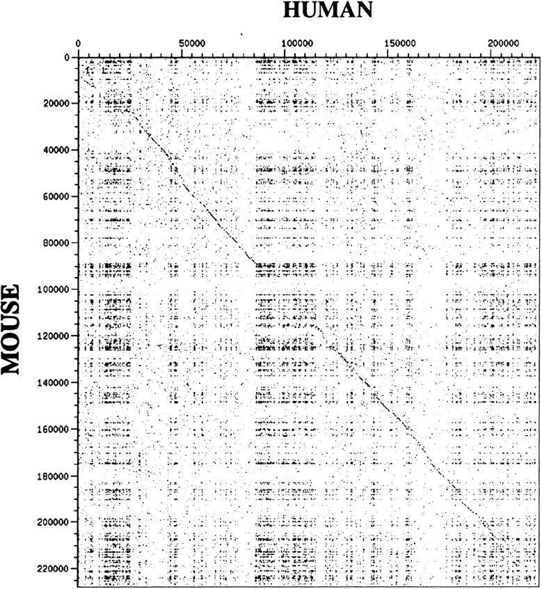 Human and mouse sequence comparison by DOTTER. The human and mouse nucleotide sequence positions are indicated on the axes.