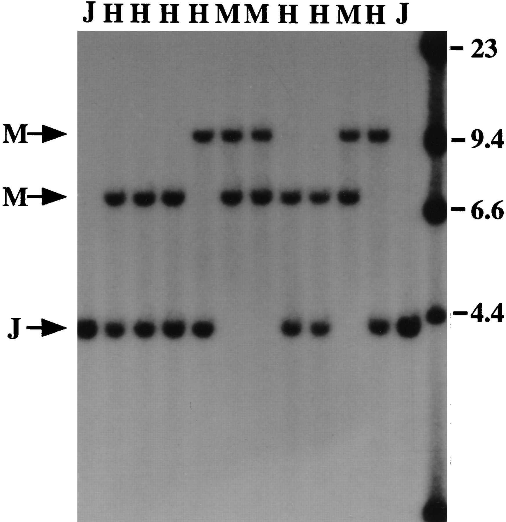 RFLP observed in 10 segregating Ar. subalbatus F2progeny following hybridization with the Ae. aegypti LF115 probe. RFLP alleles representing the parental Japan strain (J) and Malaysian strain (M) are indicated. (H) Heterozygote. This locus is on chromosome 2. Size markers as determined usingHindIII-digested λ phage DNA markers are given.