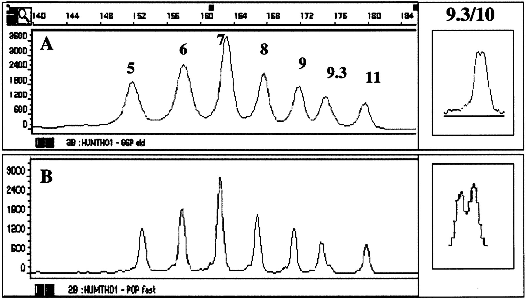 Separation of the allelic ladder HUMTHO1. THO1 was separated by use of condition GSP1 (A) or POP-4a (B). The number of repeat units is indicated. A size scale is aboveA. The separation of the genotype 9.3/10 of THO1, by the described conditions, is shown in the insets.