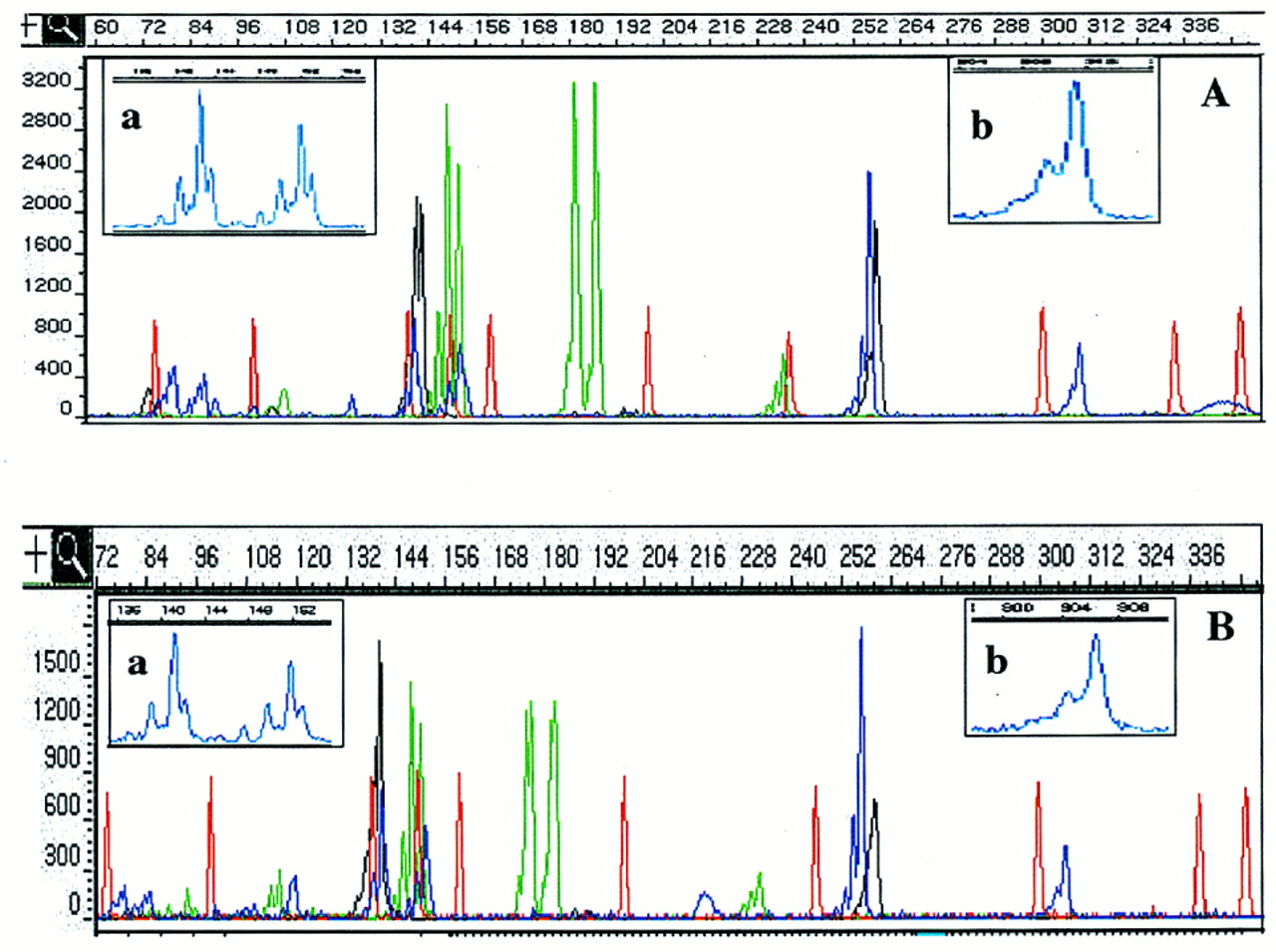 Separation of CEPH sample 1340-033. CEPH sample 1340-033 was separated by use of condition GSP2 (A) or POP-4b(B). The separation of the 12 loci of the sample between 60 and 352 nucleotides is displayed. Insets a and b show a magnification of size ranges, as indicated by the scale above each. Peaks in a are 1 nucleotide apart, and in b, 2 nucleotides.