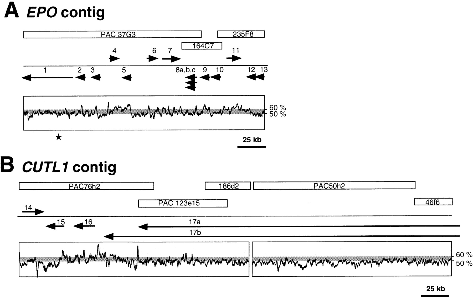 Map of the sequenced contigs. Sequenced clones are drawn as open rectangles containing the clone names. Arrows indicate the genes and their transcriptional directions. The genes are (1) ZAN, (2)EPO, (3) CDS1, (4) CDS2, (5) GNB2, (6) ACTL6, (7) TFR2, (8) CDS3, (9)PCOLCE, (10) CDS4, (11) LRN, (12)IRS3L, (13) HRBL, (14) CDS5, (15)PMSL12, (16) APS, and (17) CUTL1. The GC content is drawn below the gene arrows with a step of 1000 and a sliding window of 100. (A) EPO contig. The single sequencing gap is indicated by a star. (B) CUTL1contig. The cloning gap is not drawn to scale.