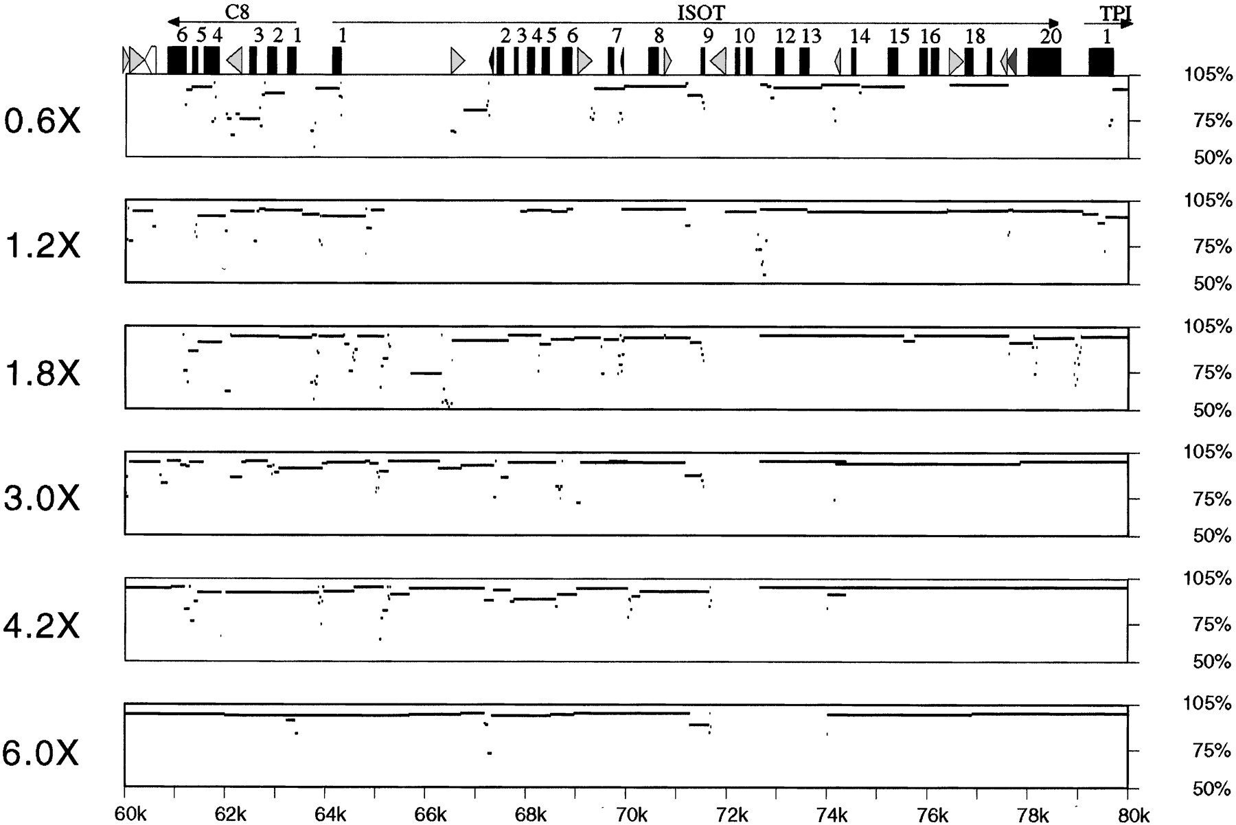 Alignment of contigs generated from low-redundancy sequencing to the known sequence. The lower-redundancy consensus sequences were compared to the completed sequence that was submitted to GenBank. The distance from the start of the project is indicated at the bottom, and the percent identity is indicated at left. Exons (numbered solid boxes) and repeats [SINEs other than mammalian interspersed repeats (MIRs) are light gray triangles pointing toward the A-rich 3′ end; LINE1s are open triangles; MIR and LINE2 elements are solid triangles] are indicated at the top.