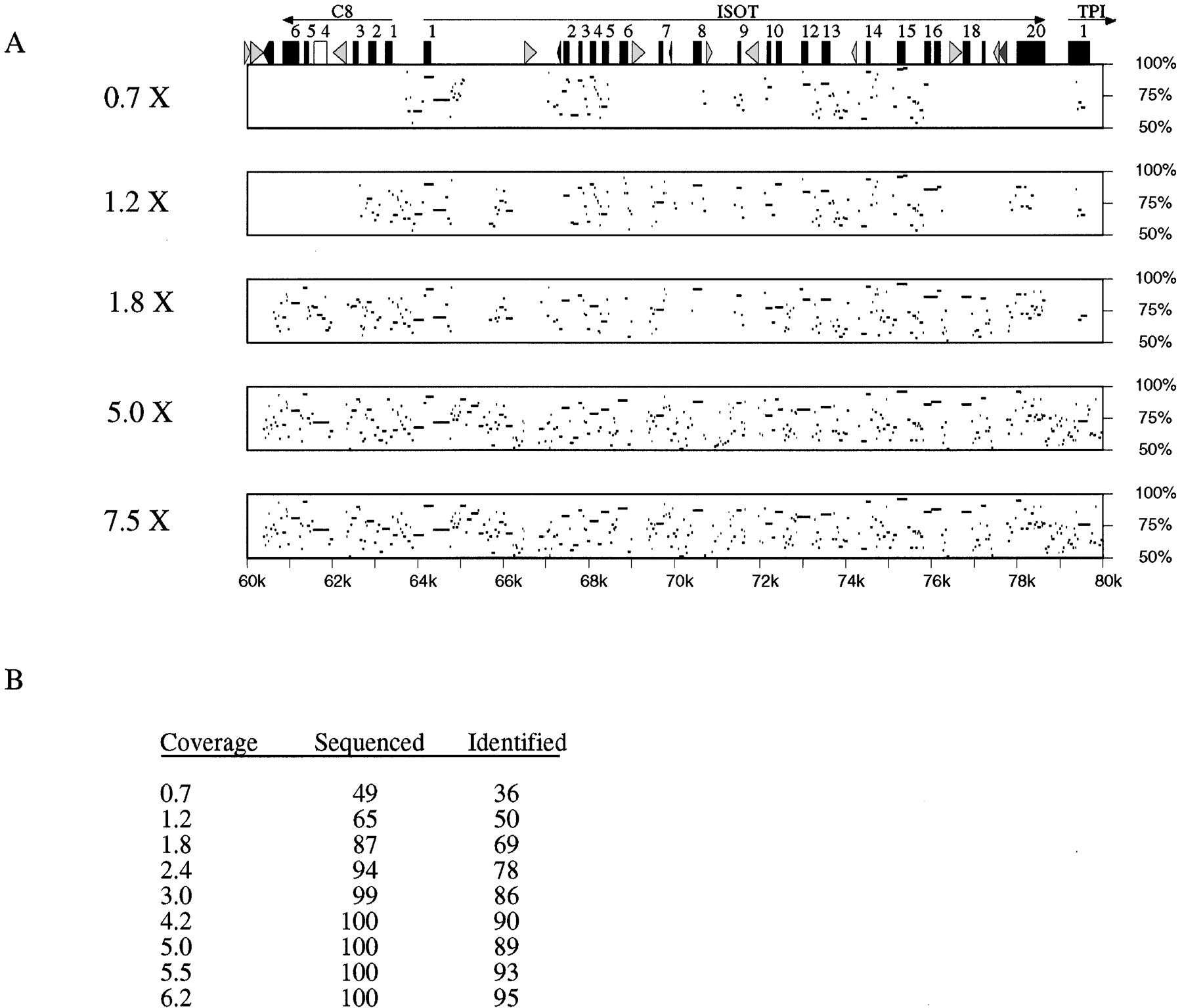 Interspecies comparisons at different levels of redundancy. The consensus sequences generated from low-redundancy sequencing simulations were aligned to the completed sequence. (A) Percent identity between the simulated consensus and the finished sequence is shown for a series of coverages. The fold redundancy is indicated at left, the percent identity is indicated atright, and the distance from the beginning of the project is indicated on the bottom. (Top) The exons and repeats are indicated (see legend to Fig. 4 for description). (B) The number of highly homologous regions that exists between the human and mouse projects was counted. The percent of these regions that were sequenced is indicated (Sequenced), as is the percent of these regions that were identified by a homology search (Identified).
