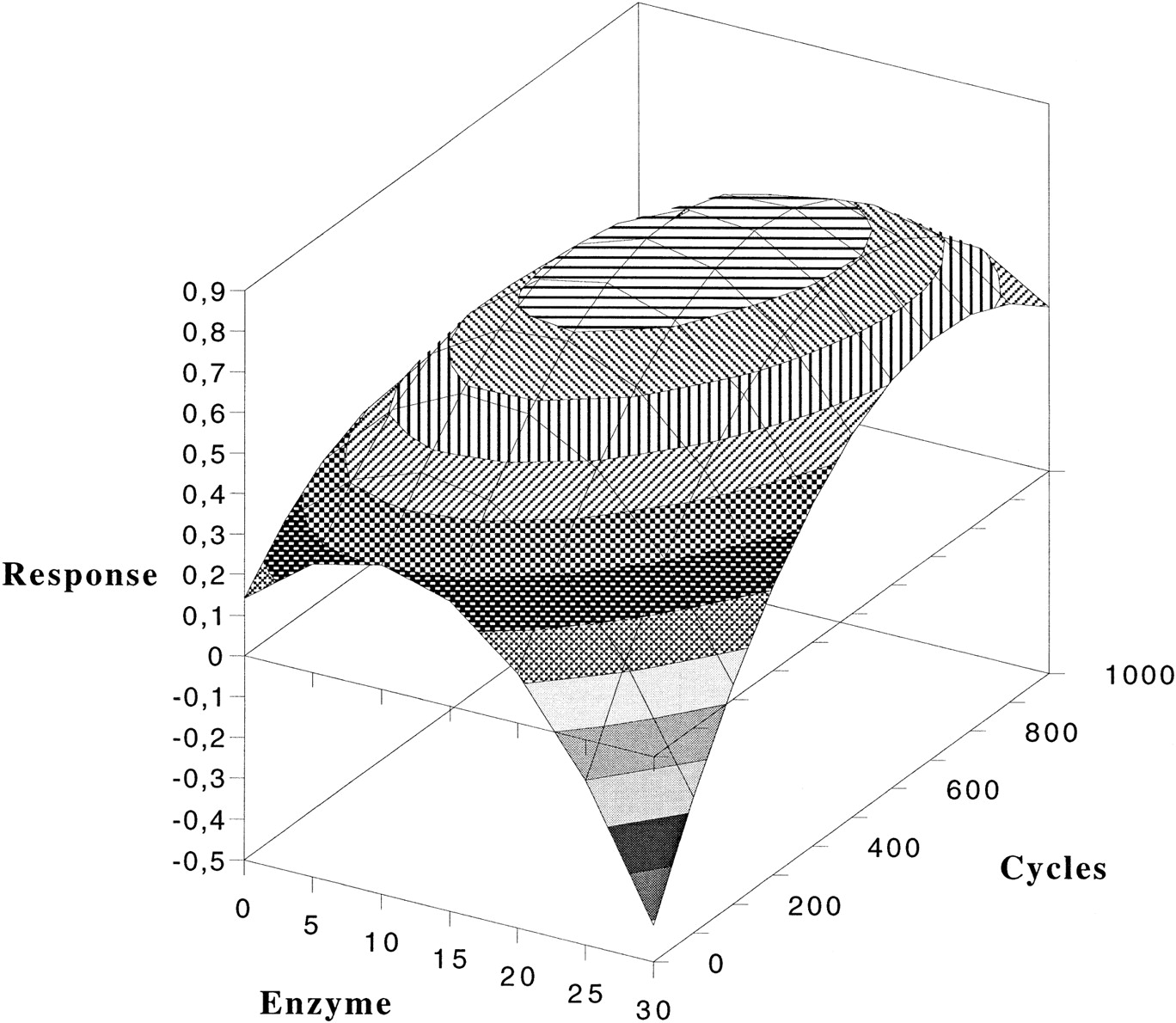 An example of a response surface plot illustrating the effects of variations in enzyme concentration and cycle number.