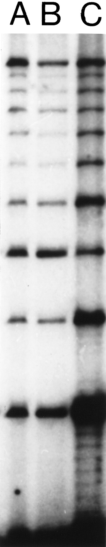 Results of RED performed on DNA from cell line GM 10 850. (A) A sample from the RED protocol used prior to improvement. (B) A standardized RED sample, i.e., a batch of pooled runs of the RED protocol used in A, see under Quantitation. Because of evaporation, the amount of sample applied to the electrophoresis gel was slightly smaller for individual runs (A) than for pooled runs. Thus the amount of product is slightly higher in lane B. (C) A RED sample from the new protocol predicted to give a higher yield. It included a low annealing/ligation temperature (72°C), higher Ampligase concentration (29 units), and was cycled cycled 950 times. We observed a 3.2-fold higher yield of the 360-nucleotide band than an average RED run with the protocol ofSchalling and coworkers (1993).