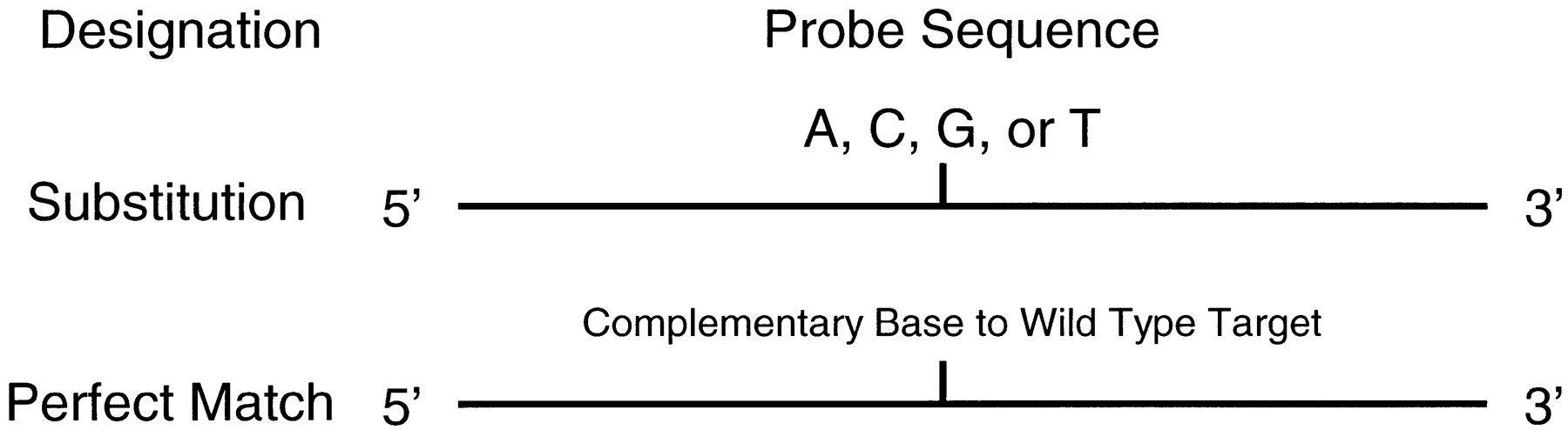 Classes of arrayed oligonucleotides. Each position is interrogated with 10 separate 25-mer oligonucleotides, 5 (two wild-type and 3-base substitution) each for sense and antisense strands. Substitution probes contain each of the four-nucleotide substitutions 13 bases from the 3′ end of the oligonucleotide (one of these will represent the wild-type sequence). A redundant set of wild-type perfect match probes are tiled in the lower portion of the array.