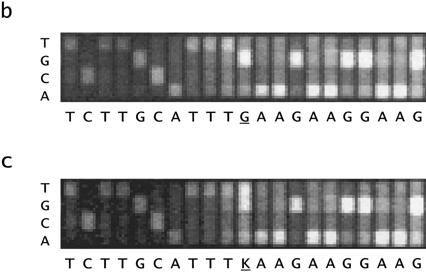 Chip image comparisons for a heterozygous nucleotide substitution. (a) False colored image of GMO8388 target hybridization to anATM sense array (1.2 × 1.2 cm) is given. Probes with greatest hybridization signal are given in white and red; those of lowest signal are given in blue and black. A magnified view of the probe sets (50 μm feature size) interrogating nucleotide position 5932 in samples GM11261 (5932 G/G) and GMO8388 (5932 G/T) is shown inb and c, respectively. The identity of the interrogated ATM cDNA nucleotide positions 5922–5942 is given with IUPAC ambiguity codes and position 5932 is underlined.