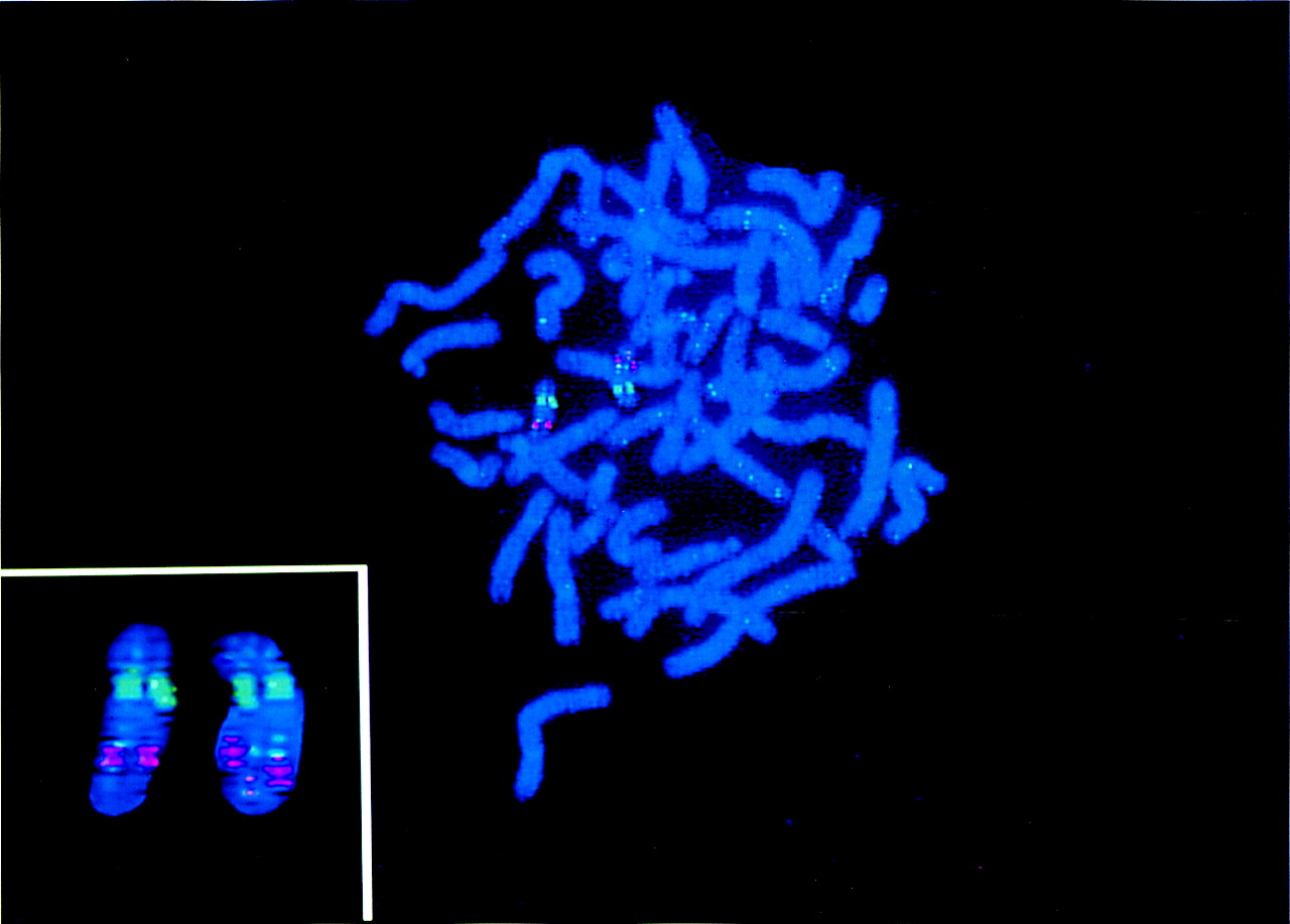 Cytogenetic mapping. BAC DNA is visualized by the light blue signal. The red signal is derived from the 19q13.1-specific probe. (Inset) Both chromosome 19 homologs enlarged.