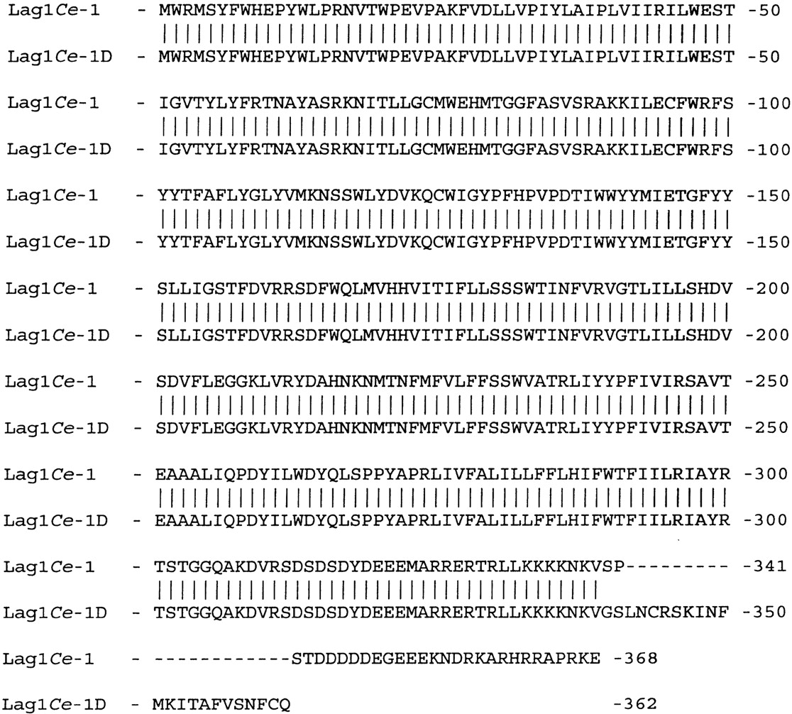 The sequence of Lag1Ce-1 protein. The splice site of the last intron in this gene is different (LAG1Ce-1) from that predicted by theC. elegans Genome Project (LAG1Ce-1D).