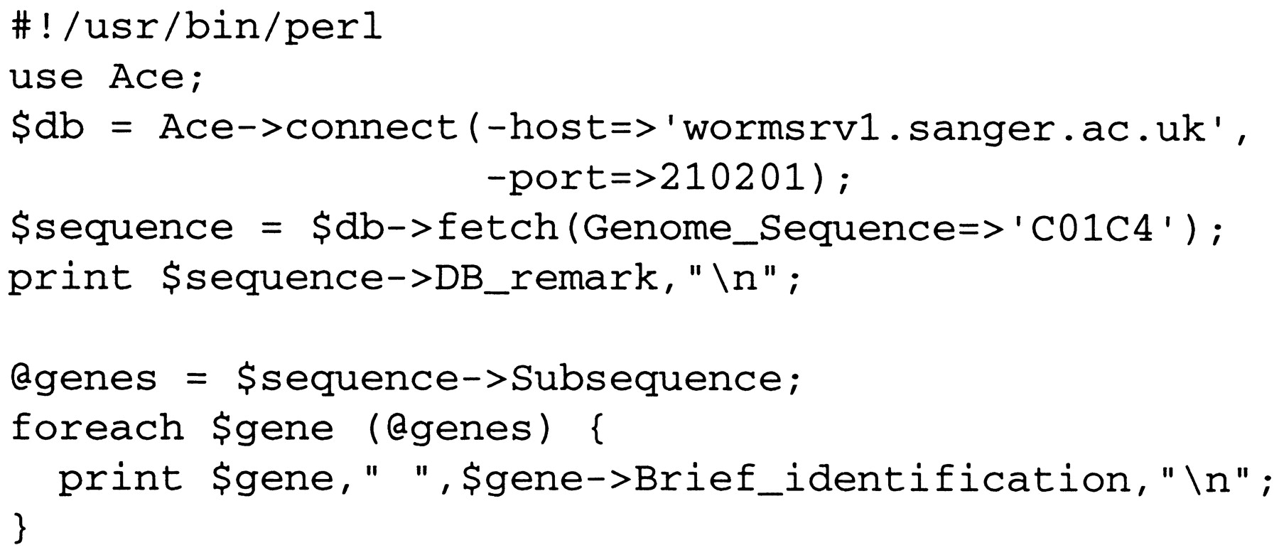 This program fetches and displays information about a C. elegans genomic sequence and its predicted genes.