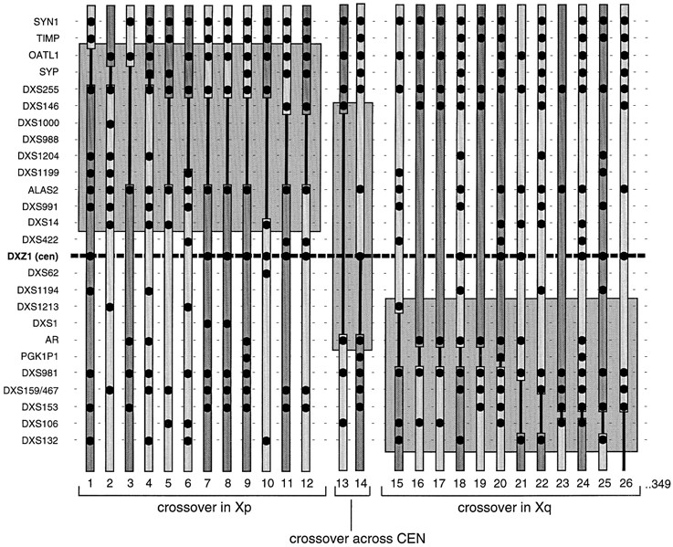 Inheritance of loci in the pericentromeric region of the X chromosome in the 26 individuals (of all 349 CEPH meioses; see Methods) in which a recombination event occurred between markers DXS255, DXS153, or intervening loci. Positions of each of the 27 loci are indicated by regularly spaced broken lines and the centromere by bold broken lines (center), and do not reflect genetic distances. Order of these loci is taken from published consensus maps (Nelson et al. 1995; Miller et al. 1995; Nagaraja et al. 1997). Light- and dark-shaded regions, respectively, represent paternally or maternally derived X chromosome material. Between them, solid, vertical lines illustrate regions within which a meiotic recombination event must have occurred. (•) Loci that were both informative and genotyped in a specific meiosis. Recombination events occurred on chromosomes passed to individuals1–12 in Xp, individuals 15–26 in Xq, and possibly across the centromere only in individuals 13 and 14.