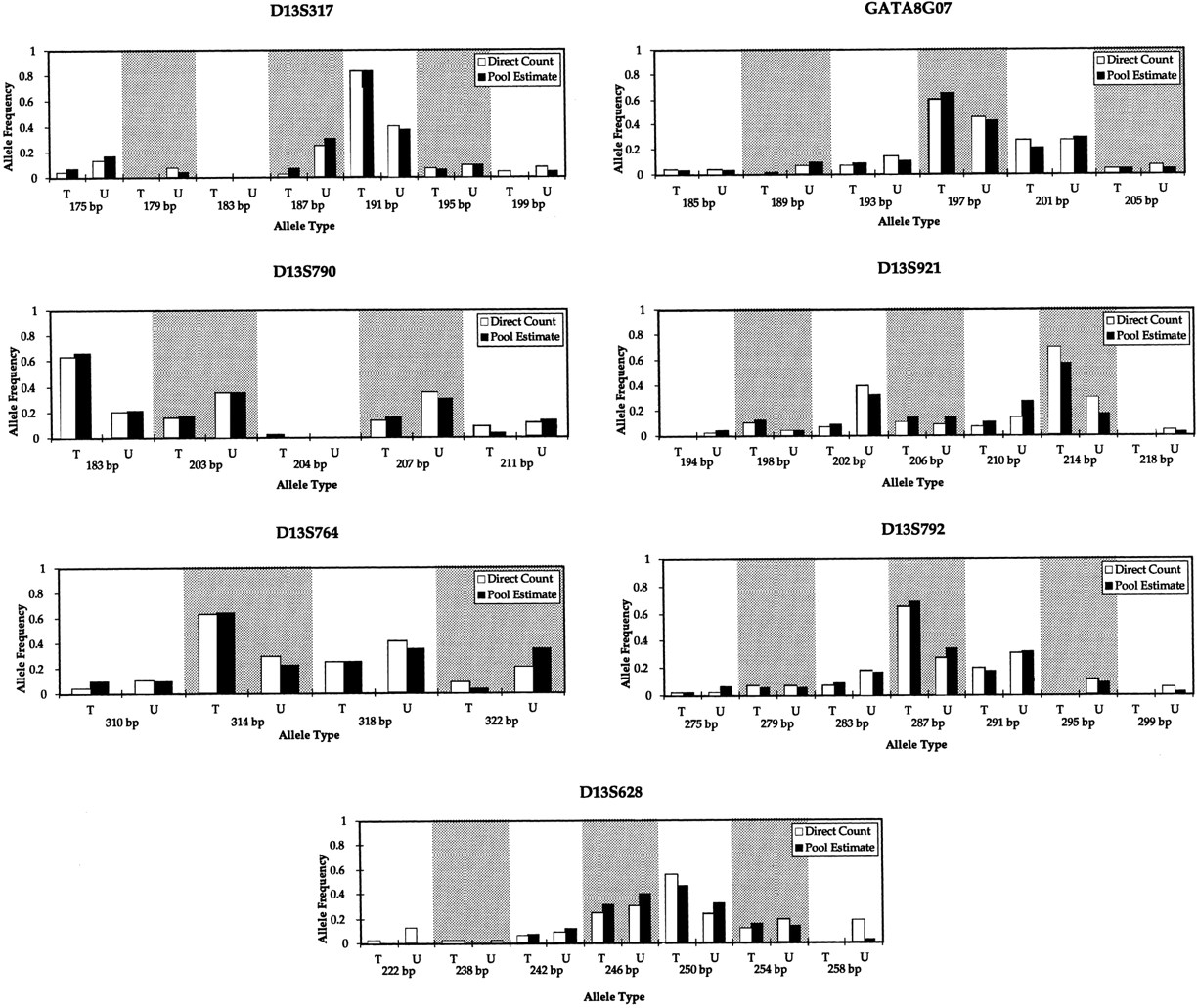 DNA pooling of HSCR-associated genetic markers. T and U parental allele frequencies estimated from direct genotyping and from two DNA pools (27 HSCR affected offspring and their parents) for markers on human chromosome 13q flanking the HSCR susceptibility gene EDNRB.For visual clarity, white and shaded stripes have been used to separate T and U frequencies on adjacent alleles. The legend follows that in Fig. 2.