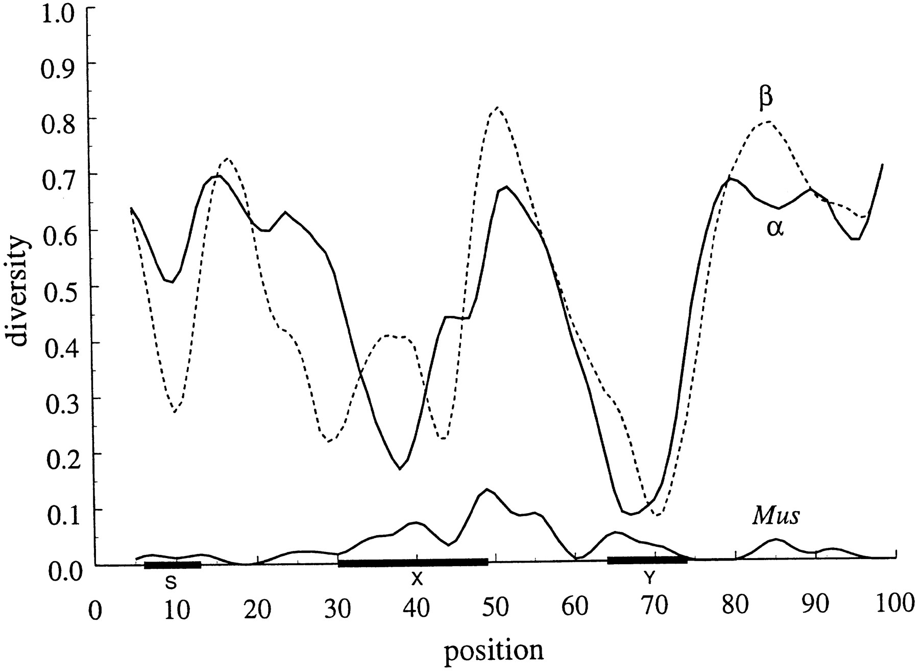 (Top two curves) Diversity of promoter sequences in distantly related class II genes over 6 sequences (104 bases in length) from 3 species (α chain) and 7 sequences (103 bases in length) from 4 species (β chain) (see Methods). The diversity is represented by a moving average computed with a Gaussian kernel 2 nucleotides wide. (Bottom curve) Moving average over Mus promoters (repeated from curve in Fig. 1).