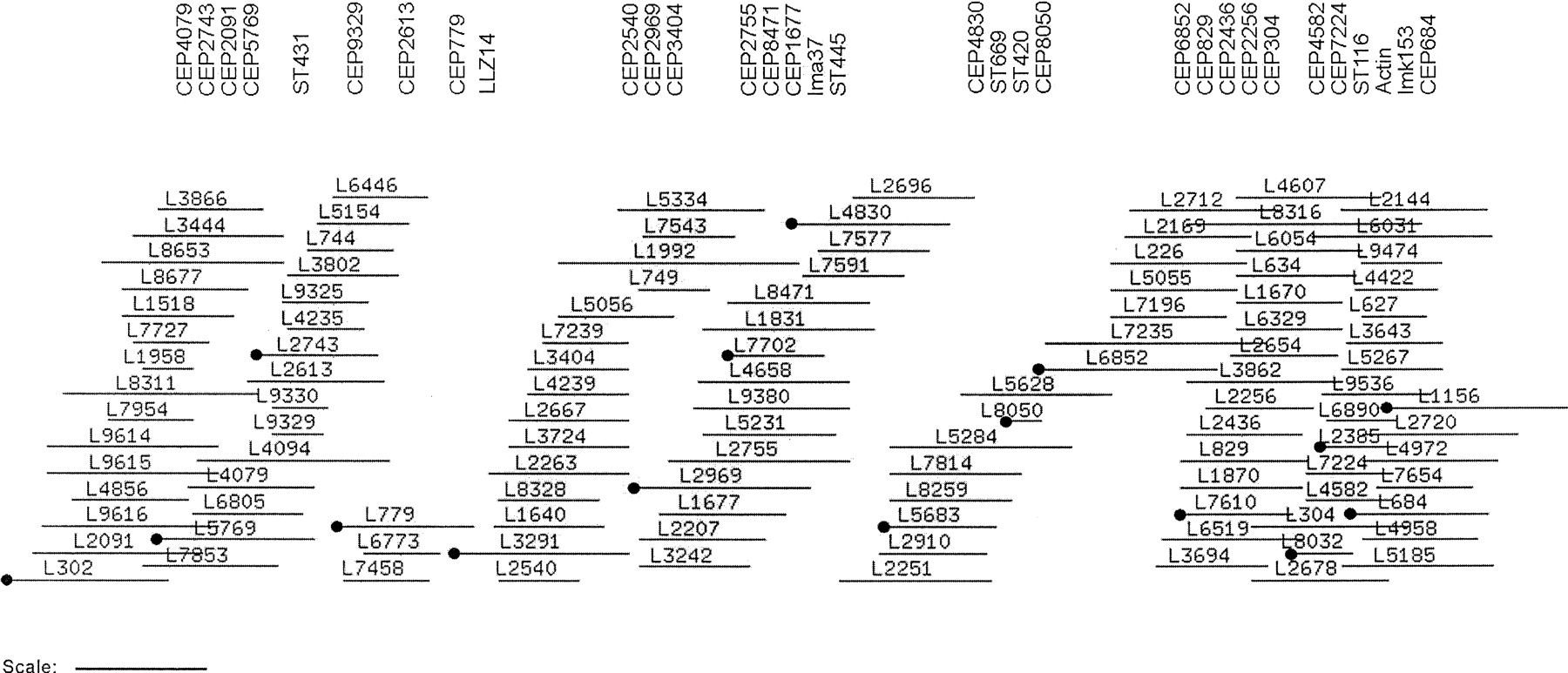 Minimum tile set for chromosome 4. L. major Friedlin cosmid clones were fingerprinted, as detailed in Methods, prior to contig assembly by CONTASP and FPC v. 2.8.2 software. Subcontigs shown to contain chromosome 4 marker loci were joined by (1) the application of additional software packages: MAPSUB (identified loose fingerprint matches), EXTEND (identified potential end–end joins), and (2) hybridization data (assigned and joined subcontigs), to yield an integrated map. The contig display from FPC formed the basis of this diagram. All clones that constitute the contig, including those that have been buried, are shown as horizontal lines. DNA hybridization probes are shown along the top (see Methods for probe descriptions). A minimum tile set (•) was chosen for DNA sequencing purposes. The scale bar represents 26 consensus bands (∼35 kb).