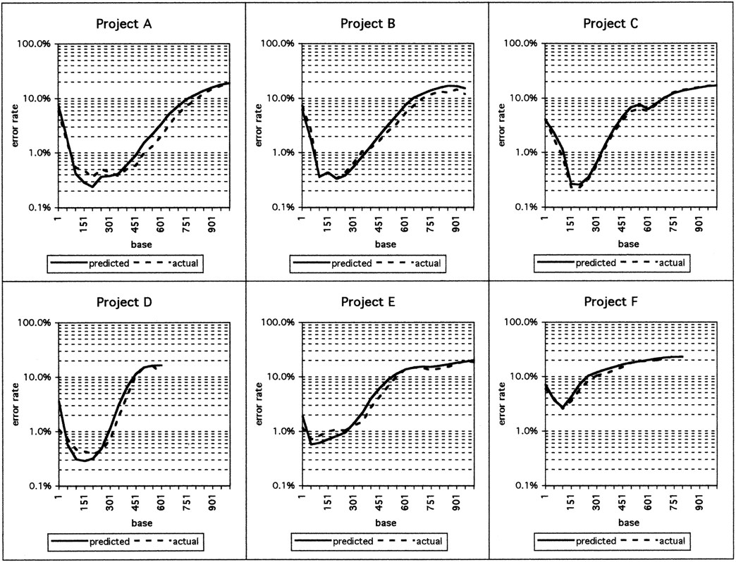 Actual and predicted error rates in six different sequencing projects. Actual error rates and predicted error rates in 50-base windows over the length of the sequence reads, averaged over all reads that could be aligned to the consensus sequence by CROSS_MATCH, are shown. The numbers on the x-axis show the first base in a given 50-base window.