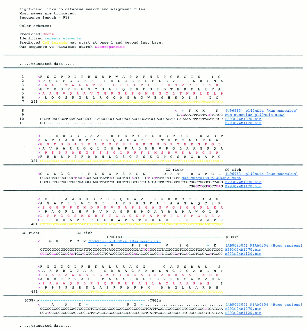 A truncated example of the analysis of a contig containing the humanDFNA1 gene, a homolog of the Drosophila diaphanous gene. Numbers at left between the first three horizontal lines are for illustration purposes only and are not in the actual display. Lines 1–6 are translations of the six reading frames of the sequence segment, displayed above the data sequence (line 7). Lines 8–11 are results from BLAST searches against public and local databases shown in alignment with the data sequence. Line8 is the result from searches against nonredundant amino acid databases, line 9 against nonredundant nucleic acid databases, and lines 10 and 11 against local database (sequencing reads). Sequences, as in lines 10 and 11,are the constituent sequences used to construct the consensus data sequence on line 7. Discrepancies between data sequence and database sequences are indicated in magenta. Line 7 displays part of a predicted CpG island displayed in orange. Lines 3and 5 contain predicted exons and are displayed in red. Other lines can be interpreted similarly. Additional database search results have been omitted. Clicking on the right-hand link will lead to the web page for relevant database search results in BLAST output format for details of the matches. From this web page, further links can lead to complete entries of the relevant data in remote databases. (No repeat elements or ESTs have been found in the displayed segment).