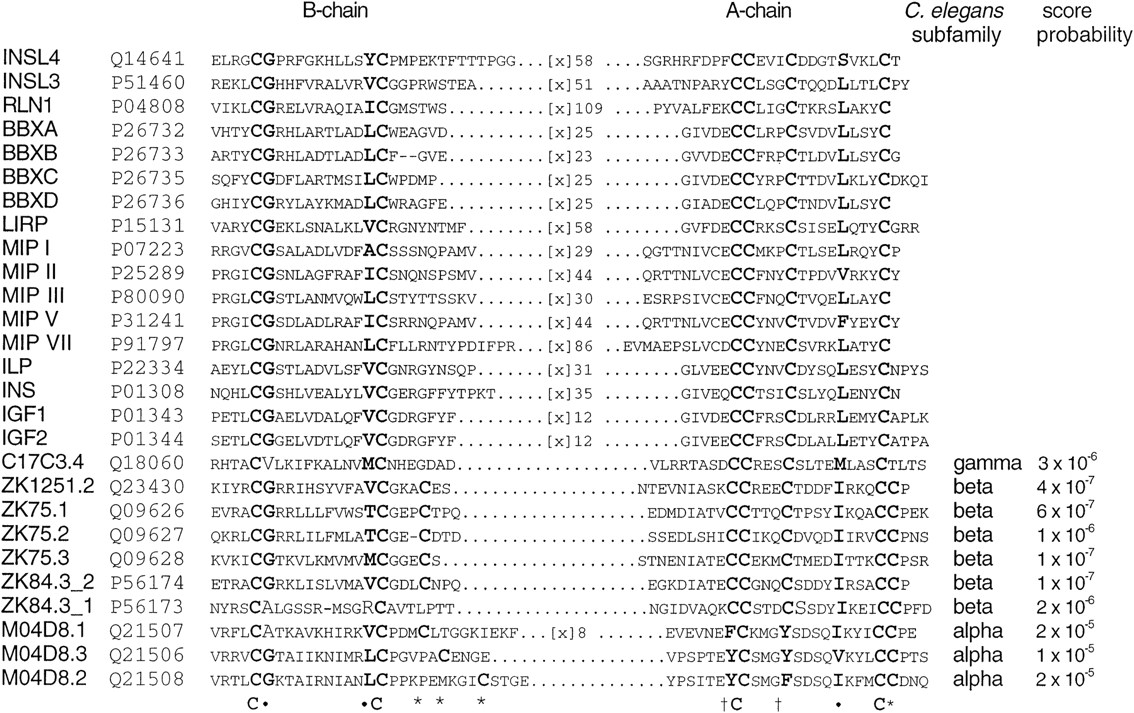 Alignment of C. elegans ILPs with representatives of all currently identified insulin-related families. (INSL4) Human early placenta ILP (EPIL); (INSL3) human Leydig ILP (LEY I L); (RLN1) human prorelaxin H1; (BBXA, BBXB, BBXC, BBXD) B. mori bombyxin (BBX) A9, B1, C2, and D1; (LIRP) locust insulin-related peptide. (MIP I, MIP II, MIP III, MIP V, MIP VII) Molluscan insulin-related peptides; (ILP) Amphioxus ILP; (INS) human insulin; (IGF1, IGF2) human insulin-like growth factor I and II (IGF II). C. elegans insulin-like peptides: (C17C3.4) γ type; (ZK1251.2, ZK75.1, ZK75.2, ZK75.3, ZK84.3_1, ZK84.3_2: β-type; (M04D8.1, M04D8.2, M04D8.3) α type. (*) Positions of cysteines involved in the additional disulfide bond between B and A chains of α and β types. Daggers indicate positions of Phe or Tyr substituting the disulfide bond within A chain of α type; (C) conserved cysteines; (•) other conserved positions. SWISS-PROT/TREMBL accession nos. are shown. The length of the nonconserved peptide linking B and A chains is indicated.