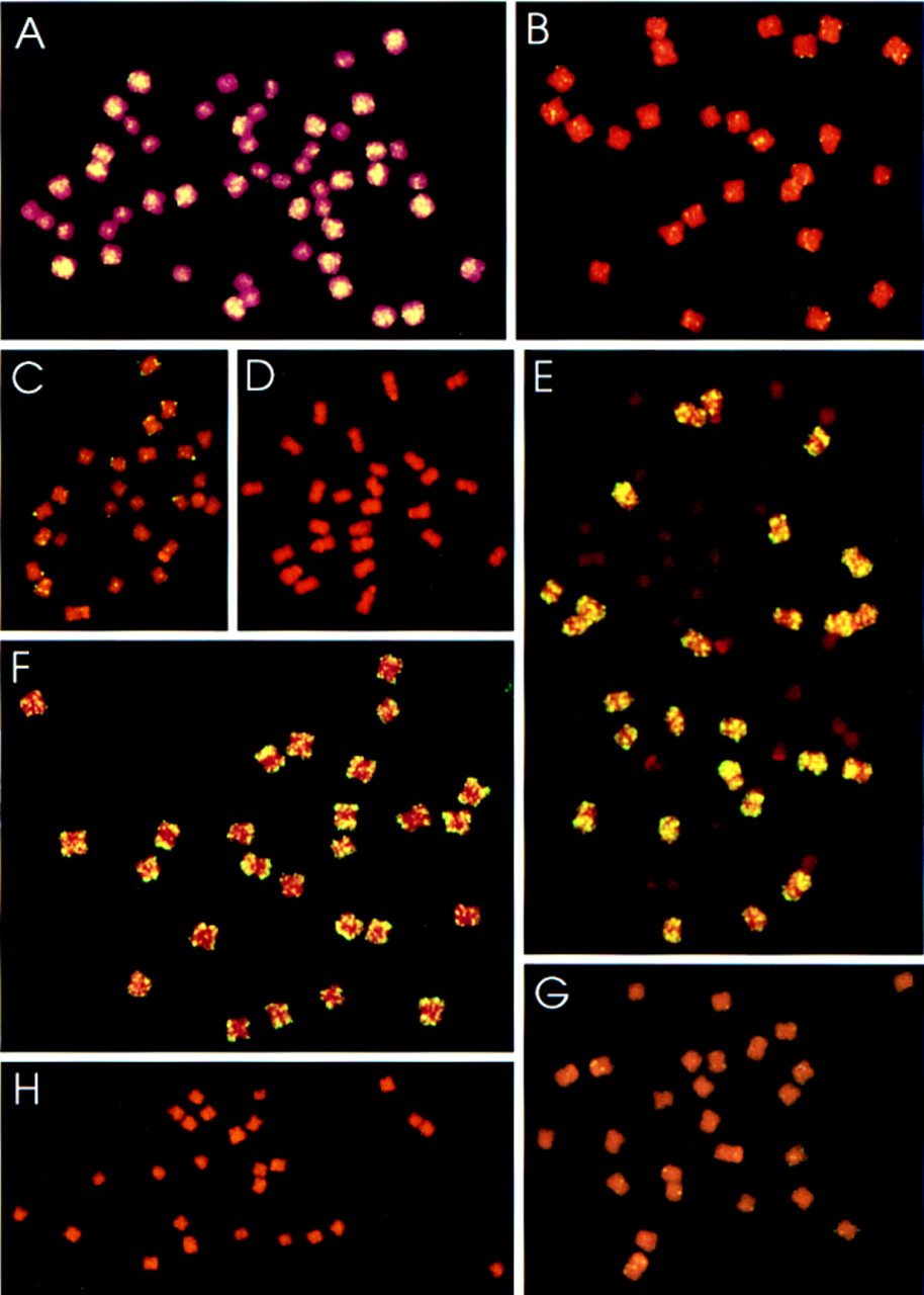FISH analysis of dispersed repetitive DNAs in cotton. (A–D) Probe pXP224 on G. hirsutum, G. arboreum, G. gossypioides, andG. raimondii, respectively. (E–H) Probe pXP137, onG. hirsutum, G. arboreum, G. gossypioides, and G. raimondii, respectively.