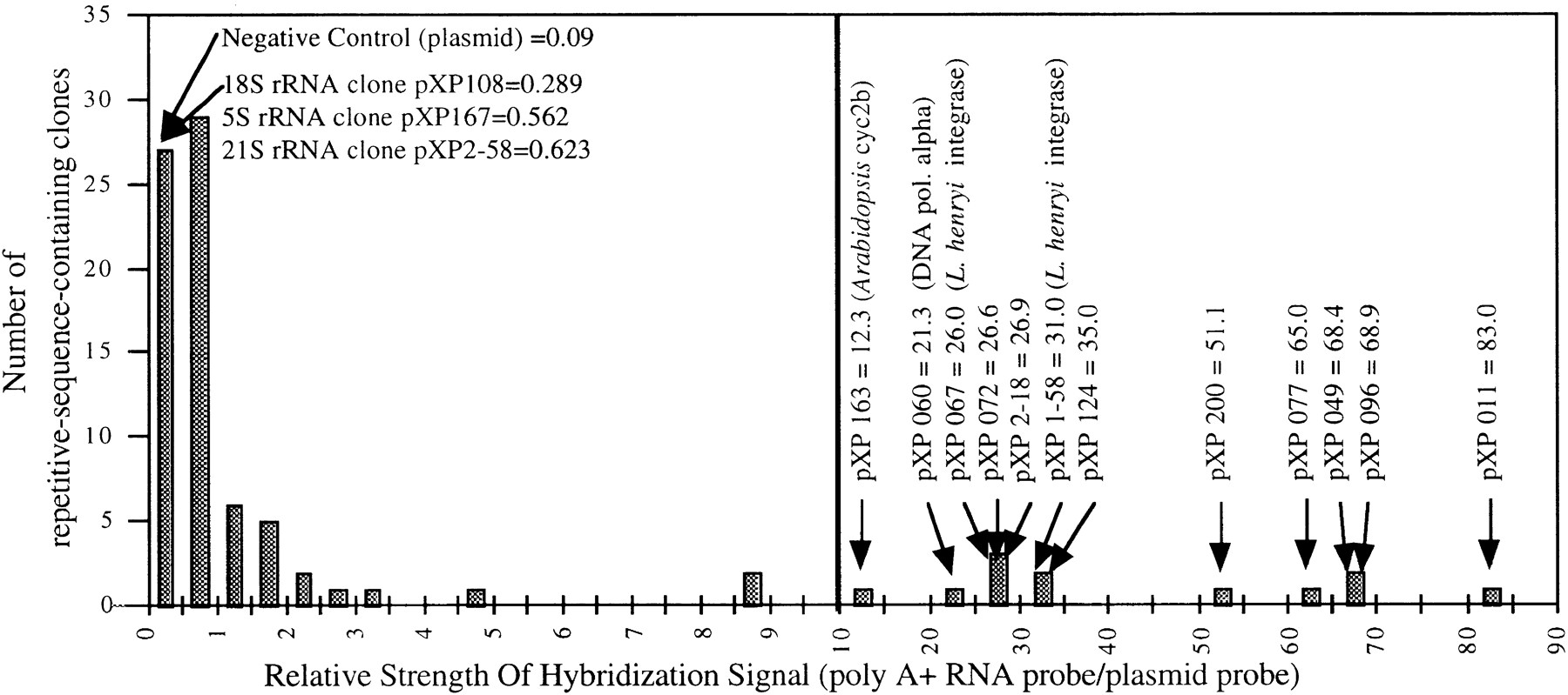 Hybridization of radioactively labeled first-strand cDNA made from seedling poly(A)+ RNA to 1 μg of slot-blotted DNA from the individual repetitive clones. Hybridization intensity is expressed as a ratio of signal (quantified by densitometry) from hybridization with labeled cDNA to signal from hybridization with labeled plasmid DNA. Triplicate values for the negative control (1 μg of slot-blotted plasmid DNA) averaged 0.09. A total of 12 individual repetitive DNA clones showed ratios of >10, or 100 times the negative control. DNA sequences corresponding to high-signal repetitive DNA clones are indicated.