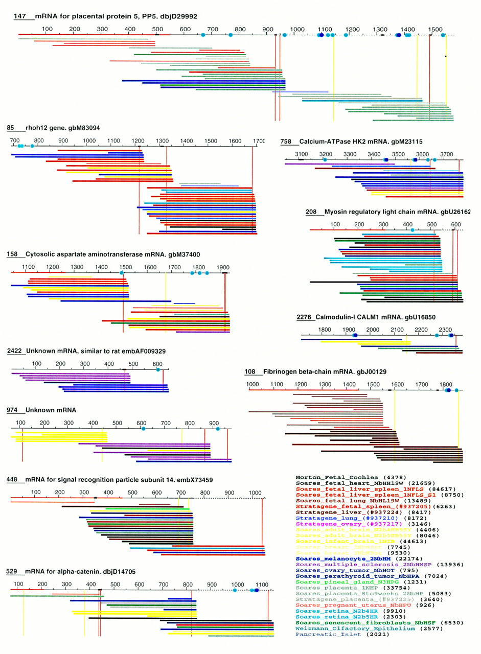 Clusters of 3′ ESTs aligned with their respective contigs (top line of each cluster). Contigs annotated with a GenBank entry name can be considered as identical to the corresponding mRNA (BLAST2 score ⩾ 2000, 97%–99% identity over highest scoring segment). (Unknown mRNA) Contigs do not show any significant resemblance (BLAST score ⩾150 or P ⩾ 0.02) to a human non-EST sequence in GenBank release 104. mRNA extensions are shown with broken lines. Contigs that do not extend corresponding mRNAs are numbered from the mRNA 5′ end; other contigs are numbered from position 1. Thicker segments in contigs indicate possible internal priming sites (see Methods). Potential destabilization signals are shown with blue and dark blue dots, corresponding to sequences AUUUA and UUAUUUA(U/A)(U/A), respectively. ESTs are colored according to their source library, as indicated at bottom right. Numbers in parentheses indicate the total number of ESTs in each library. Red lines on contigs indicate coding sequences. Vertical red and yellow lines give the positions of all AAUAAA and AUUAAA sequences, among which are the actual polyadenylation signals (see text). Only ESTs that fully match their respective contig are shown. Clusters are numbered according to the number of ESTs they contain (1 is largest).