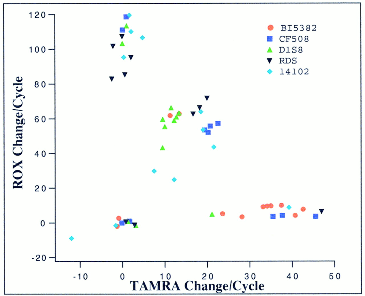 Scatter plot of initial slopes of change in fluorescence intensities. The linearly normalized initial slopes of ROX and TAMRA fluorescence intensity changes of 60 samples (10 human genomic plus 2 salmon sperm DNA samples for each of the 5 markers/mutations) are plotted together. A normalization constant is used for each marker such that the data points can be plotted together on the same scale.