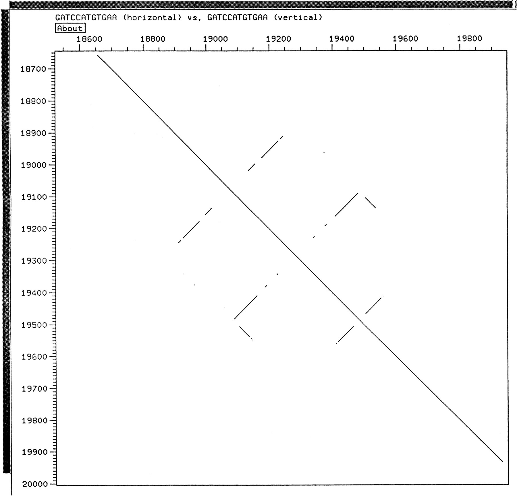 View of the finished region of F59D12 in DOTTER (Sonnhammer et al. 1994) showing comparison of the sequence with itself. The main diagonal from top left to bottom right shows the in-phase identity. The three broken lines perpendicular to the main diagonal represent the three inverted repeats that caused the problem. The short lines parallel to the main diagonal are the tandem repeats that allowed 400 bp to delete.