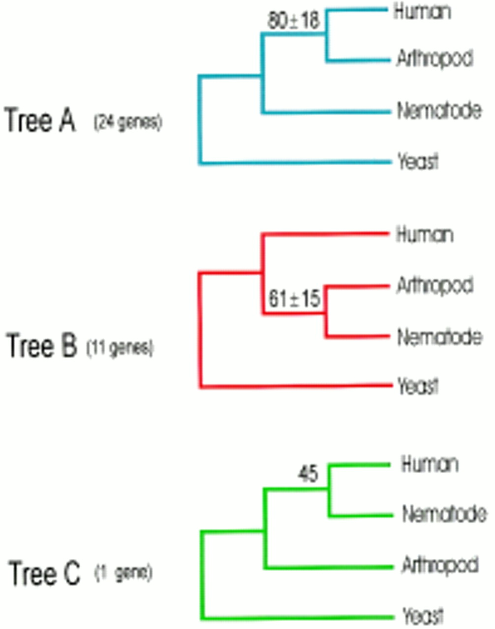 The three possible topologies for a tree describing the evolutionary relationships between nematodes, arthropods, and humans. Tree A (blue) reflects the conventional interpretation of metazoan phylogeny with nematodes as a “protocoelomate” group basal to arthropods and humans. Tree A was supported by neighbor-joining analysis of 24 protein quartets as described in the text. Tree B (red) represents the “Ecdysozoa” phylogeny derived from 18S rRNA gene sequences of a variety of nematodes and arthropods (Aguinaldo et al. 1997), and is supported by 11 protein quartets. Tree C (green) is not expected from any metazoan phylogenetic hypothesis and is supported by a single protein quartet. Average bootstrap values and their standard deviations are shown for each tree.