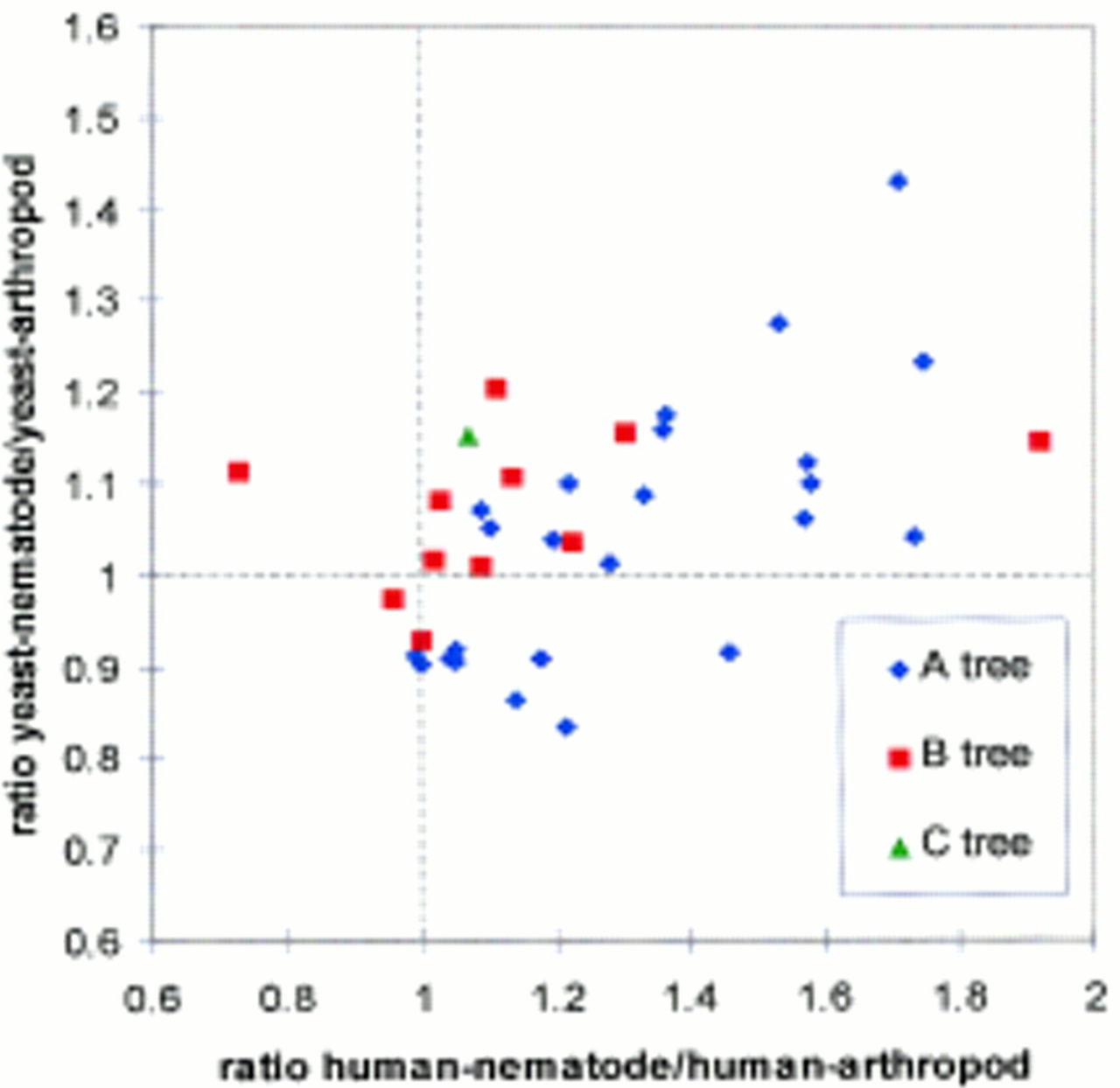 Four-way relative rate plot of evolutionary distances for 36 proteins. The ratio of evolutionary distances from (human–nematode)/(human–arthropod) for each protein is plotted on thex-axis, where a ratio of 1 would be expected if the proteins were evolving homogeneously in those branches assuming that arthropods and nematodes are sister taxa. The ratios of evolutionary distance from (yeast–nematode)/(yeast–arthropod) are plotted on they-axis, which should equal 1 if a protein evolved homogenously in the nematode and arthropod lineages. The position where thex-axis and y-axis both equal one represents the region where genes would fall if they evolved homogeneously in all four taxa, if Tree B is correct. Proteins to the right of the vertical line at x = 1 should favor tree A, proteins to the left should favor tree C, whereas proteins falling near the diagonal line should favor tree B. The distribution of the 36 orthologous proteins is skewed, with those that yield tree B (red squares) scattered uniformly around the diagonal line (with one exception, CDC42 supports tree B but falls to the extreme right of the graph), whereas all of the proteins that yield tree A (blue diamonds) are scattered to the right of the diagonal. The quartet favoring tree C is shown in green (triangle).