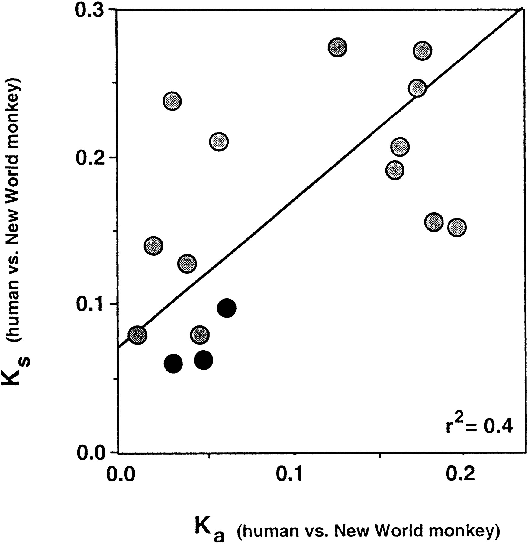 Synonymous substitution per synonymous site (K s) vs. nonsynonymous substitution per nonsynonymous site (K a) for 16 human–New World monkey coding sequence pairs. The values calculated for RNase k6 pairs are indicated with black circles. The shaded circles represent values calculated for 13 coding sequence pairs originally reported by Rosenberg et al. (1995)including ECP, EDN, interleukin-3, CD59, protamine P2, protamine P1, SRY, insulin a-chain, interferon-γ; complement C4a, insulin b-chain, c-myc proto-oncongene, and EGF-like growth factor. (See Rosenberg et al. 1995 for Genbank accession nos. for these sequence pairs).