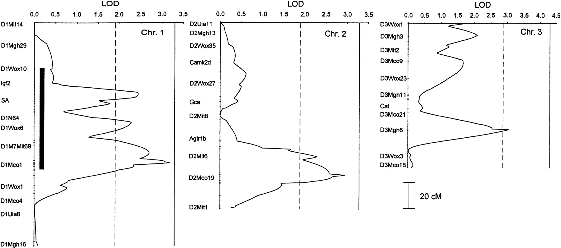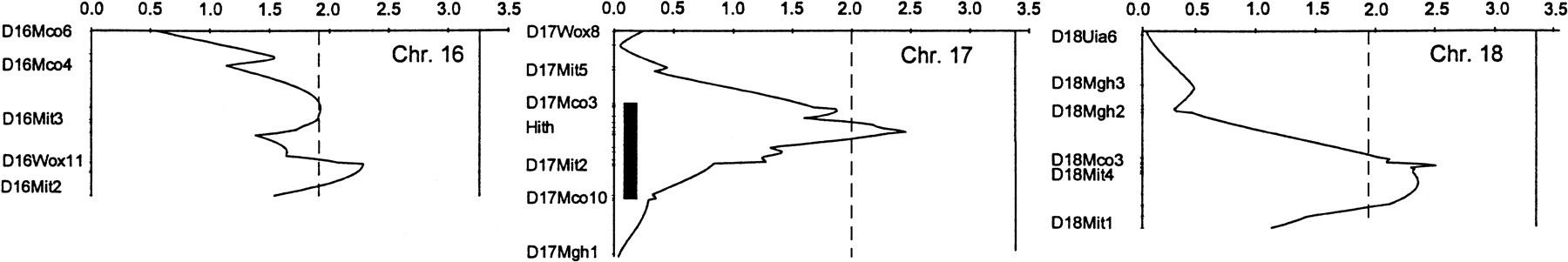 lod plots for linkage to blood pressure for all chromosomes for which at least suggestive statistical evidence for linkage was found. Because different models (listed in Table 3) were used to fit the data for each chromosome, the thresholds vary for different chromosomes. The broken, vertical line is the lod threshold for suggestive linkage; the solid line is for significant linkage as defined by Lander and Kruglyak (1995). The thick bars on the plots for 1, 5, 10, and 17 represent the area of the LEW chromosome introgressed into S rats in the construction of congenic strains. Only representative markers are shown.